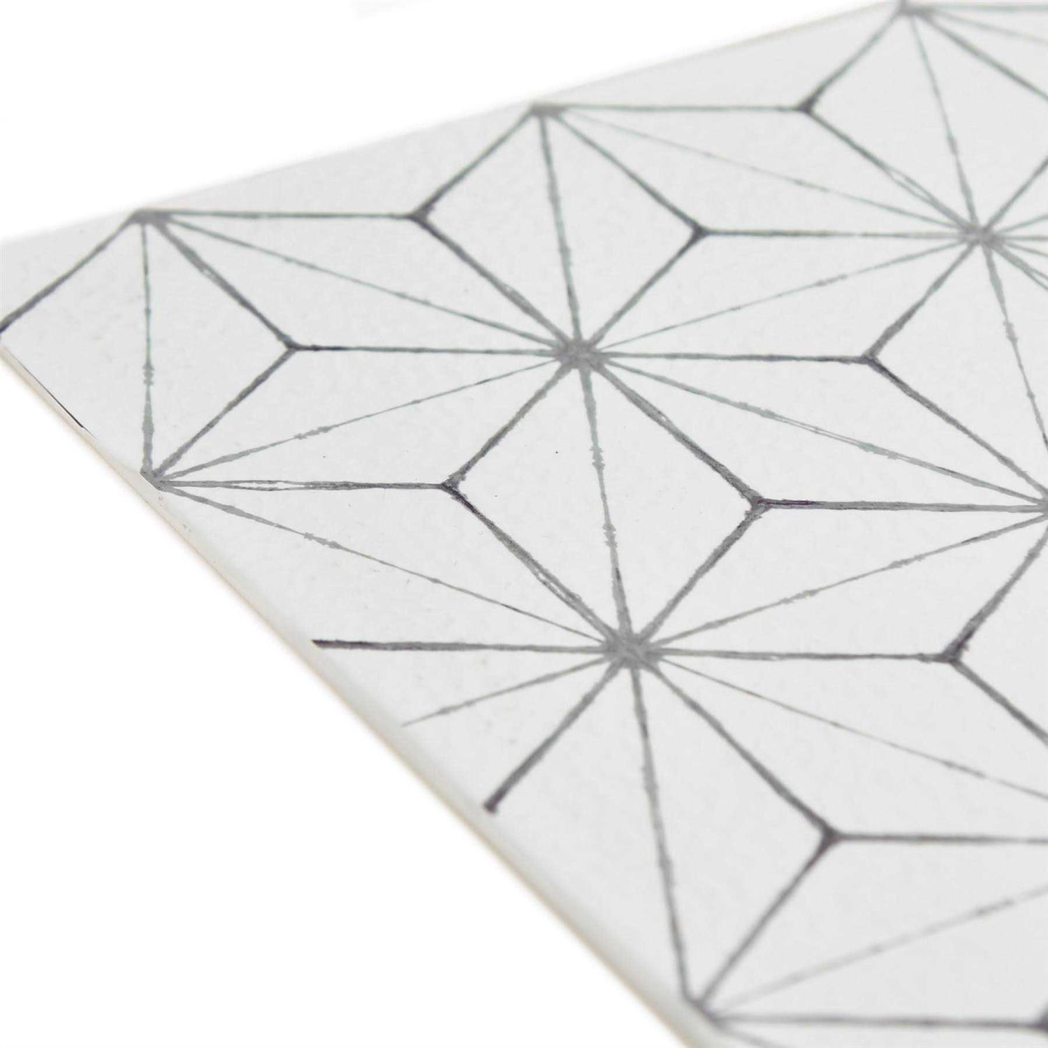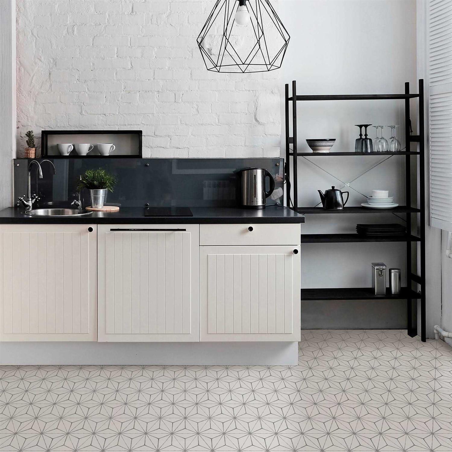 Give a room a makeover with these Kikko Peel and Stick Floor Tiles. The crisscrossing lines give the look of an intricately tiled floor and the gray and white geometric design will add modern detail to any room in your home. The peel and stick vinyl floor tiles pack contains 10 pieces on 10 sheets that measure 12 inch x 12 inch. They’re made from a water-resistant and washable vinyl material and have a permanent adhesive. They’re easy to apply and require no grout or special tools for installation.