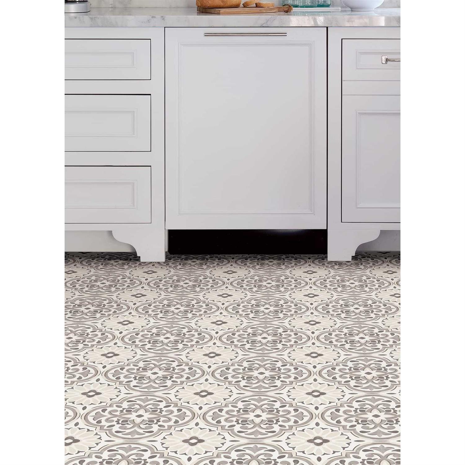 - Grey and cream peel and stick vinyl floor tile with a modern farmhouse style