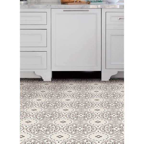 - Grey and cream peel and stick vinyl floor tile with a modern farmhouse style.