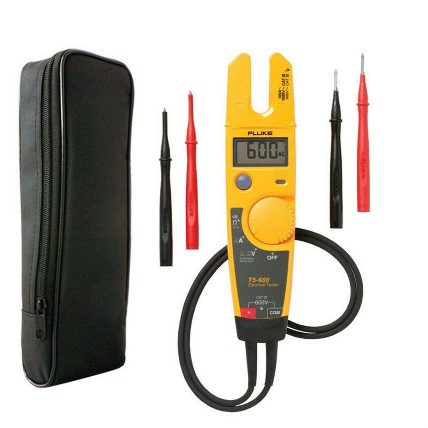 Electrical Tester With Open Jaw Clamp 600V The Fluke T5 electrical testers let you check voltage, continuity ad current with one compact tool. With the T5, all you have to do is select volts, ohms, or current and let the tester do the rest. Open jaw current lets you check current up to 100A – without breaking the circuit. Its tough test leads stow neatly in the back of the tester, making it easy to tote the T5 in your tool pouch. Detachable Slim reach test probes are customised for national electrical standards. The test leads accept optional accessories such as clips and speciality probes. The optional H5 holster lets you clip the T5 onto your belt.