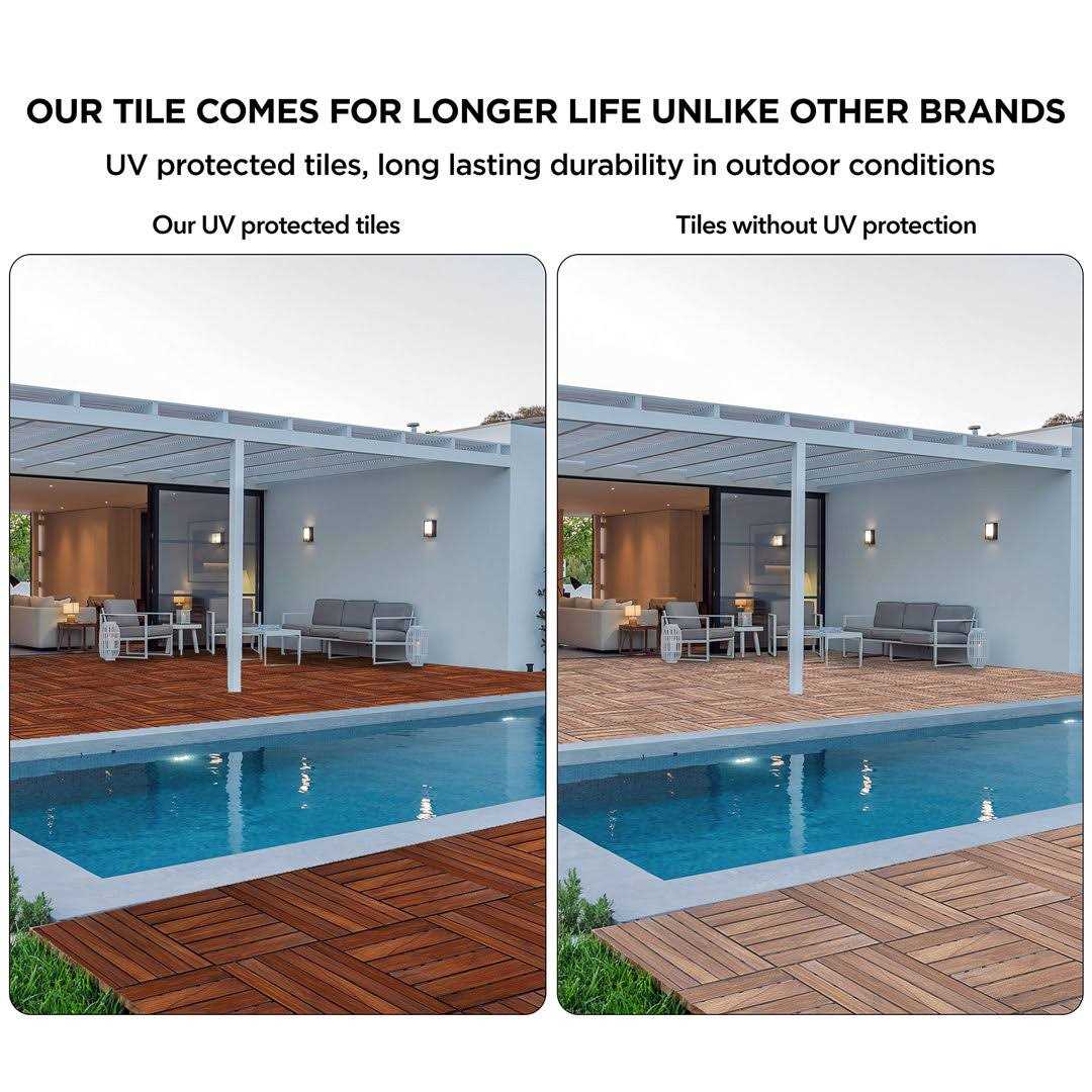RUGGED AND DURABLE 100% solid teak wood tiles and hence stronger. Base made of PPC, and not PE, so doesn’t break easily unlike competition. UV PROTECTED TO BE WEATHER RESISTANT AND NOT FADE Our wood tiles for patio are coated with oil UV protection for longer life and outdoor use. An annual oil coat adds to the life of the tiles. Our outdoor patio tiles are also called as wood floor tiles, outdoor tiles, outdoor tiles interlocking, wood tiles outdoor floor, patio floor, patio tile, snap tiles, patio flooring interlocking tiles, patio decking, wood deck tiles, balcony tiles, teak shower floor, snap tile flooring, floor wood panels, snap laminate flooring, outdoor flooring over grass, teak floor tiles, shower floor wood deck, wooden floor tiles, terrace flooring, teak tiles, wood tile outdoor, outdoor interlocking floor A COST-EFFICIENT SOLUTION TO INCREASE THE VALUE OF YOUR PROPERTY Use in patio deck, porch pavers, backyard decking, garden pathways, pool side decks, ground covering kit. Interior flooring applications include shower mats, bathroom, balcony, apartment welcome mat, living room carpet, study room, terrace, home office work area, reception desk and more! EASY TO INSTALL. EASY TO REMOVE. NO TOOLS NEEDED! Modular tiles with SNAP LOCK mechanism. Lay your tiles in different interesting arrangements like straight lay, herringbone pattern, double parallel lay. Remove and reuse the tiles at a different place, no hassles! PRODUCT LIKE 3D PACKAGING Comes in an attractively designed box packaging.
