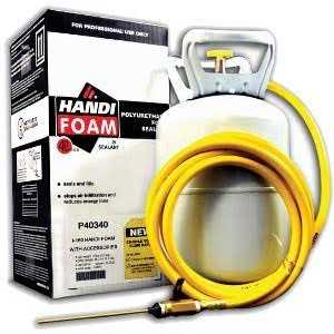 Professional polyurethane foam system saves energy.. Fills holes and blocks against insects and rodents.. Bonds to wood metal concrete brick and most plastics.. Expands 2 – 1 seals completely and is paintable.. Comes with 9-1/2 ft hose brass ball valve and a brass needle nozzle.. Tack free in approximately 10 minutes. Can be trimmed in one hour with a full cure in 24 hours. Applications – Filling voids and cracks filling gaps around pipes air sealing in retrofit and new construction. Product Note – Handi-Foam products are intended for professional use only.