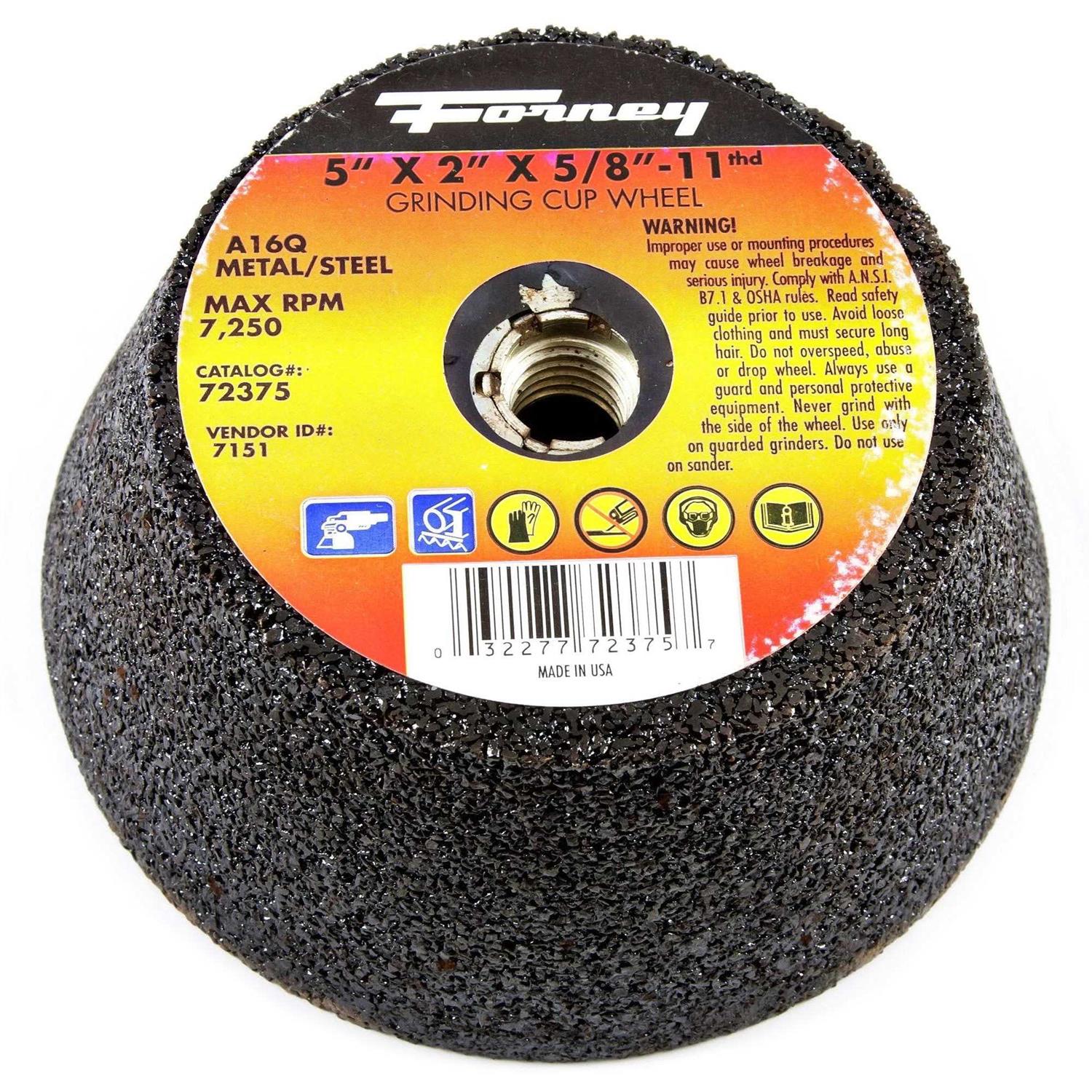 The Forney 72375 5-Inch by 2-Inch Type 11 Cup Wheel For Steel Grinding is designed for removal of large amounts of stock. Forney Industries is one of America’s longest operating family-owned metal working product companies. Founded in 1932, Forney offers more than 5,000 products for the hardware, automotive, farm and ranch and do-it-yourself markets. 5-Inch (127 mm) by 2-Inch (50.8 mm) with 5/8-Inch – 11 threaded arbor. A16Q with Max 7,250 RPM. Proof of purchase required. neglect, negligence or accident, or that has been used in any way contrary to the purpose intended.
