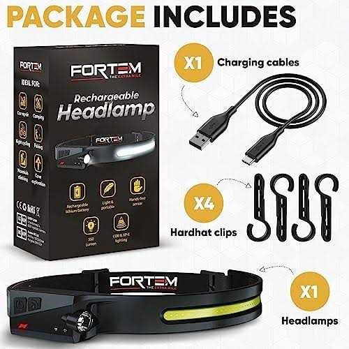 Headlamps by FORTEM. Details:FORTEM Headlamp – the ultimate lighting solution for all your outdoor adventures and indoor activities. With its powerful and durable design, this headlamp is the perfect accessory for hikers, campers, runners, and anyone in need of hands-free illumination. This unit features a high-quality XP-E spotlight and COB LED strip that delivers up to 300 lumens of brightness, providing a wide and even beam that illuminates your path and surroundings with ease. Designed with comfort and convenience in mind, this headlamp features an adjustable headband that fits comfortably on most head sizes and shapes. The lightweight and compact design of the FORTEM Headlamp make it easy to carry around and store when not in use, making it an ideal choice for backpackers and travelers. The FORTEM Headlamp is also incredibly durable, with a tough and water-resistant exterior that can withstand harsh weather conditions and rough handling. Rechargeable with provided USB-C charging…