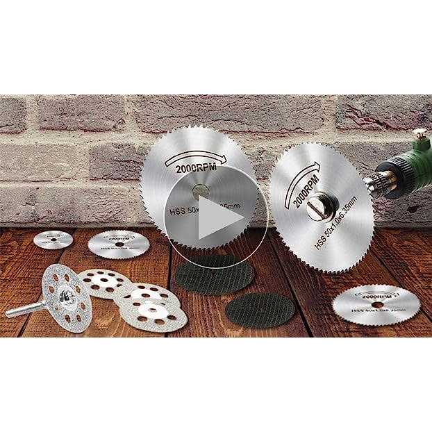 - (10 x Diamond Cutting Discs, 10 x Resin Cutting Discs, 6 x Mini HSS Saw Blades, 6 x Mandrels).