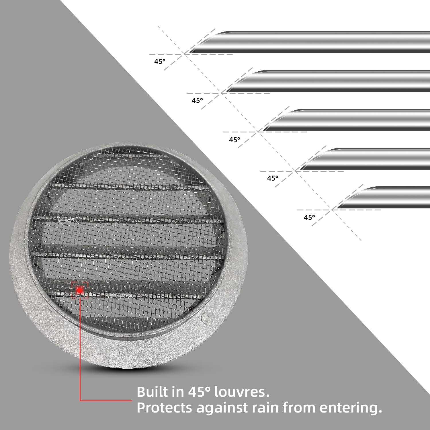 HOME IMPROVEMENT! Perfect for bathroom, kitchen, office, garages, sheds, campers and ideal for indoor ventilation use. HIGH-QUALITY MATERIALS! Registers, grilles, and vents are made of high-quality metal aluminum and are therefore particularly robust and will not rust. Grey lacquered surface. Flat construction. EASY INSTALLATION! Easy indoor/outdoor installation. Available for wall mounting or ceiling mounting. Round connection makes mounting to an air duct using self-tapping screws easy. GREAT FOR HOME USE! The back of the grille is equipped with stainless steel wire net with a hole sizes of 2×2 mm. Protects against birds and mice. Can be used as a dryer vent perfectly, so you won’t have to worry about clothing fibers blocking the vents.