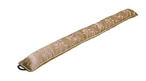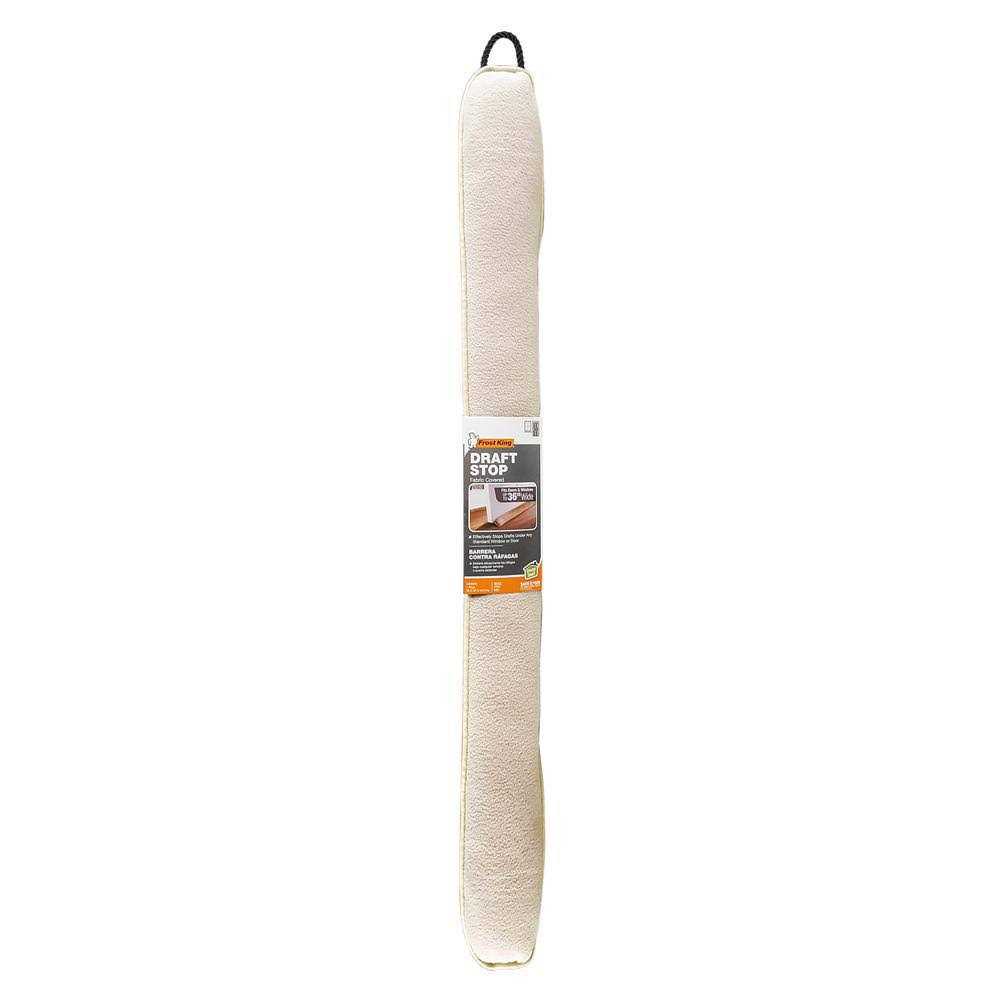 The draft stop is 36-inches long with exterior fabric made of tightly woven synthetic fleece and satin trim. It includes a woven satin handle for convenience. The fill is a nylon fiber and weighted with cotton bags filled with ground stone. The draft stop can be used on most doors and will slide with the door when it is opened and helps keep energy costs down.