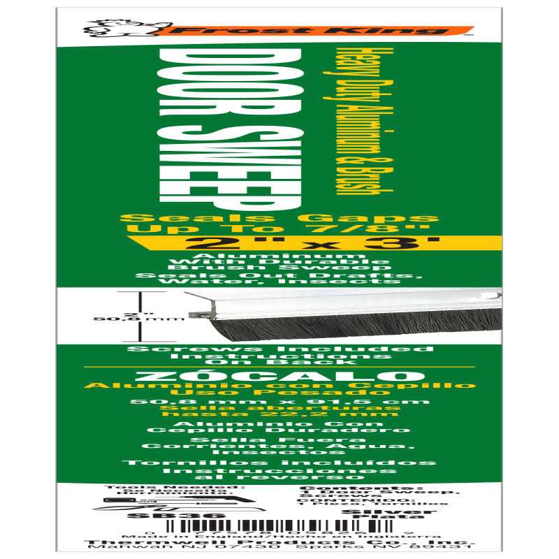 The Frost King SB36 2 x 36 inch Extra Wide Door Sweep is made with Aluminum and includes a brush to keep dust out of your house. It also enhances the look of your doors. Frost King door bottoms and sweeps come in colors and different strengths to fit your needs. This door sweep is silver in color and made of Heavy-Duty aluminum and nylon brush and can be used commercially or in residential applications. It is 36 in. x 2 in. and can seal gaps up to 5/8 in. this door sweep keeps warm air in and cold air out. It is installed with screws only on the interior side of the door.