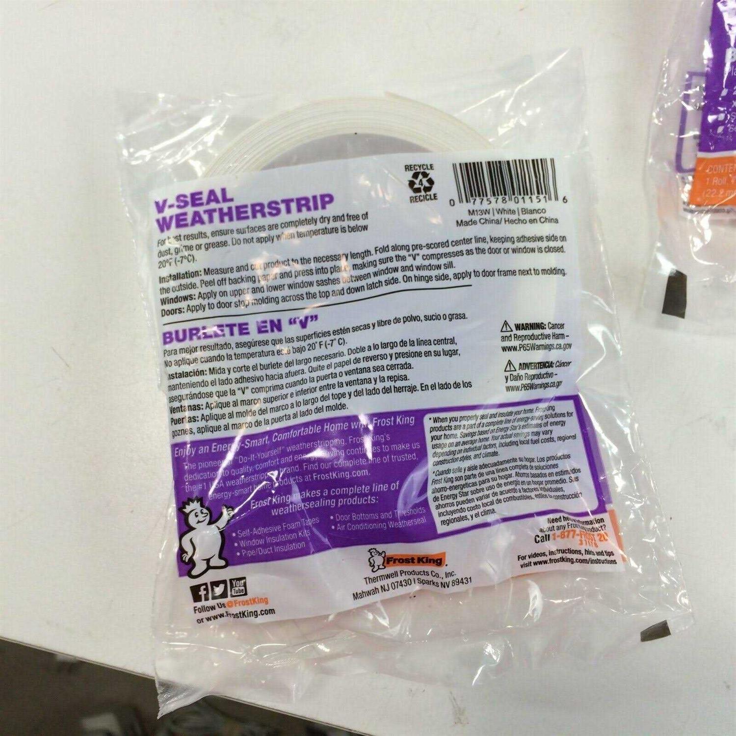 V-Seal weatherstripping is an inexpensive way to help to create a tighter seal around windows and door. It is a pre-scored polypropylene roll with an adhesive backing on one-half. To install: clean the surface where it is to be installed. Cut the weatherstripping to the desired length with scissors. Fold the weatherstripping piece into a V shape. Peel off the adhesive backing, and press into place with fingertips. One roll is 17 feet long, and is 7/16th of a inch wide when folded. The color is white.