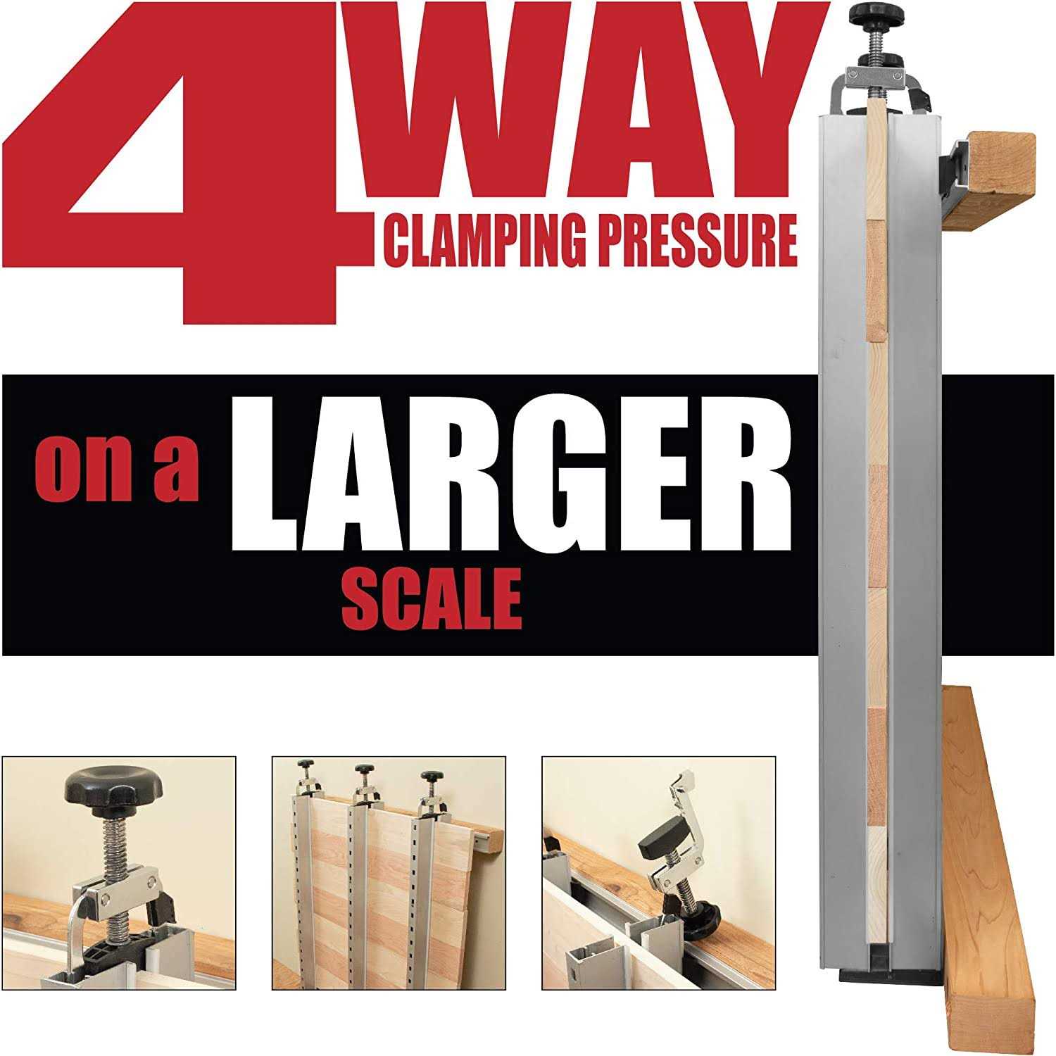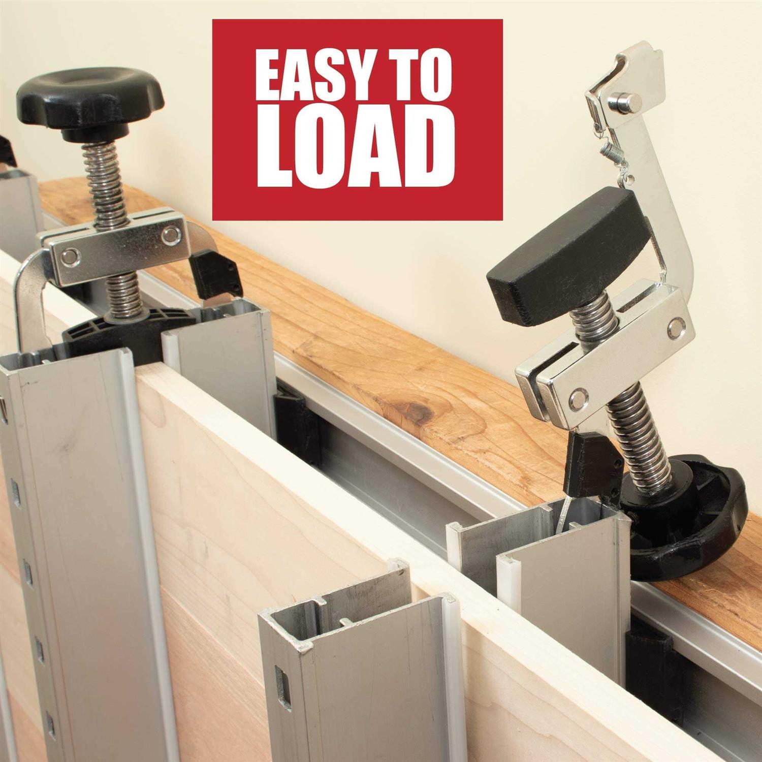 4 Way Pressure For Large Panel Glue Ups. Why struggle with multiple pipe clamps and bar clamps when you can simply use one system that makes panel glue ups easy. Simply slide in one board, then the next, then the one after that and continue that process until all of your boards are in place. Once all your boards are in the Panel Max, simply latch the Top Pressure Assembly and secure the panel. Its that Easy!
