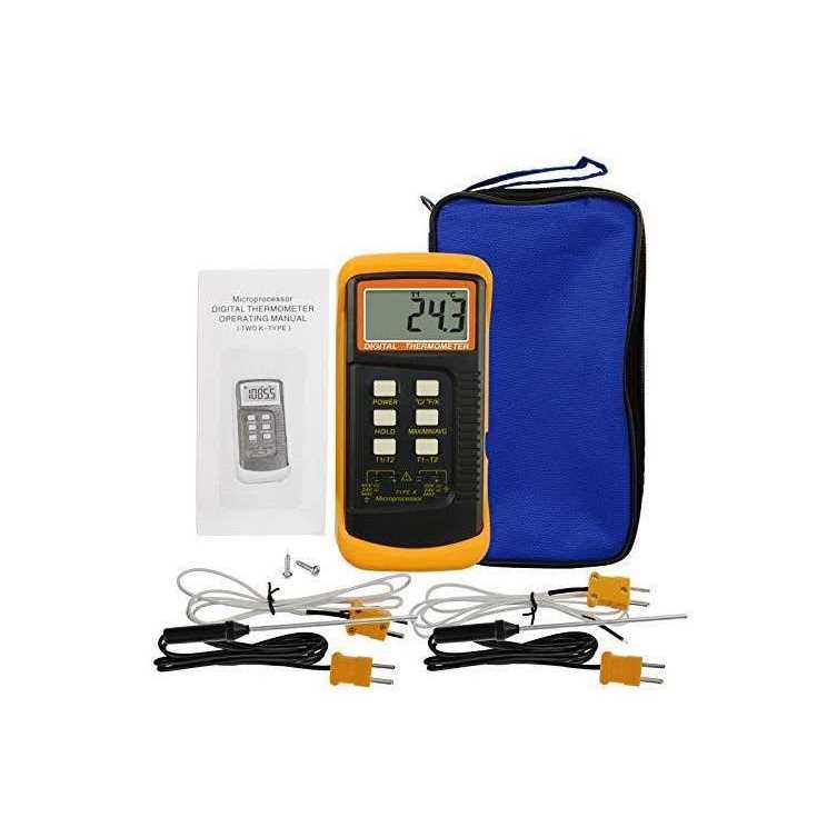 2 Temperature Display With Differential Temperature (T1-T2) – Apart From Max/min/average, Data Hold, Auto Power-off Function, This K-type Thermometer Has Specially Designed A “T1-T2” Calculation Function That Facilitates Users To Find The Difference Between 2 Samples Easily Set With 4 Thermocouples- 2 Thermocouples With Bead-type Tips And 2 Extra Stainless Steel Thermocouples Protected By silicon Rubber Holster – The Main Unit Is Protected By A Removable Silicon Rubber Holster, It Protects Your Device From An Accidental Drop And Extends Its Life Wide Measurement Temperature Range – Range Of The Main Unit Is -50 ̊C ~ 1300 ̊C (-58 ̊F ~ 2372 ̊F); Includes 2 Thermocouples that Can Measure From -50 To 400 ̊C (-58 To 752 ̊F). Comes With ̊C, ̊F And K Temperature Modes High Mobility & EASY Operation – Battery-operated, Portable And Built-in Foldable Stand And Only Operate With 6 Simple Buttons With Clear Indications, Suitable For Beginners And Professional Users. Factory Calibrated. Has Reset To Factory Setting