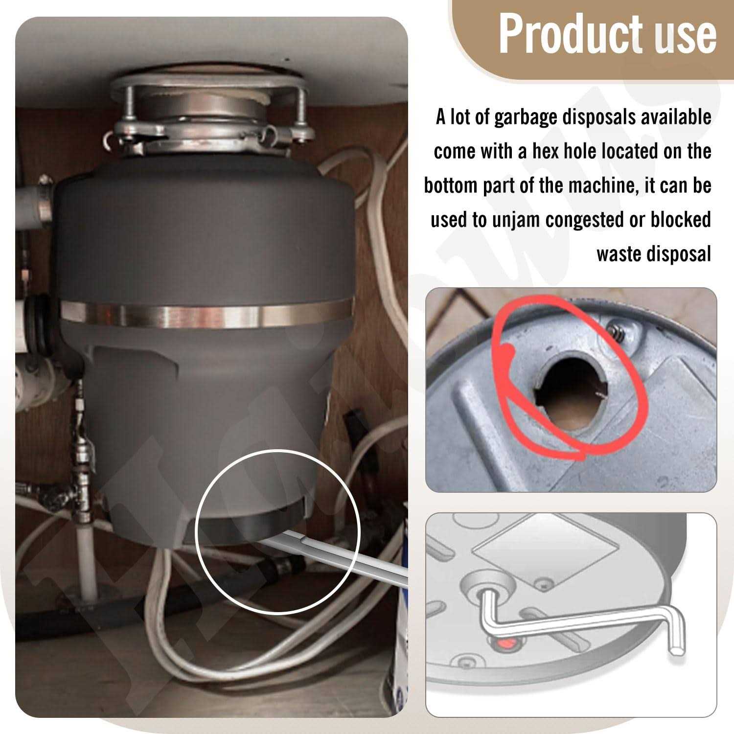 Garbage Disposal Parts by Haiouus. Details:1. Effective to fix kitchen garbage disposal: The Jam-Buster Wrench is an effective and easy-to-use tool to fix a clogged garbage disposal, a stuck garbage disposal or leaking disposal in your kitchen. 2. Quick and easy to use: insert the wrench into the center hole into the bottom of the disposer. Turn the wrench back and forth until it turns freely in both directions. 3.