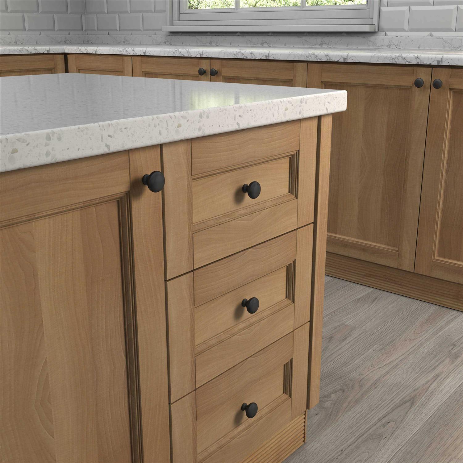Flat black finish has a soft sheen and timeless style. Contemporary round knob shape. “Easy installation. mounting hardware included (1 inch and 1.5 inch/mm screws)”. Constructed of durable zinc die-cast. Rear-mount installation.