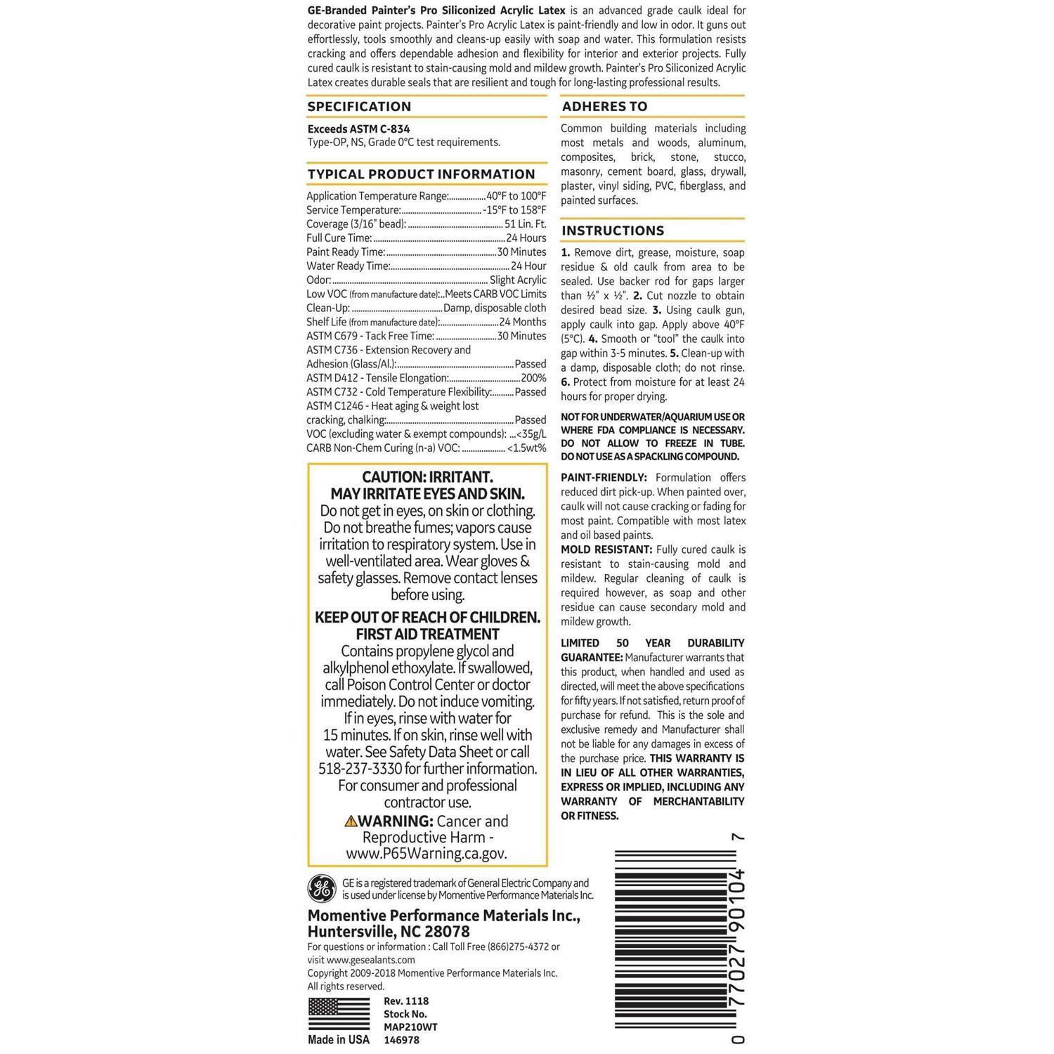 GE-branded Painter’s Pro Siliconized Acrylic Latex is an advanced-grade waterproof sealant ideal for decorative paint projects that require a flexible seal. Painter’s Pro Acrylic Latex sealant is low odor, low VOC (Meets CARB VOC limits) and ready to paint in as little as 30 minutes. This formulation exceeds ASTM C-920 for a durable and flexible seal that resists cracking and offers dependable results for both interior and exterior projects. Fully cured sealant is resistant to stain-causing mold and mildew growth and is great for both indoor and outdoor use. Painter’s Pro Siliconized Acrylic Latex sealant creates durable seals that are resilient and tough for long-lasting professional results. Backed with a 50-year durability guarantee.