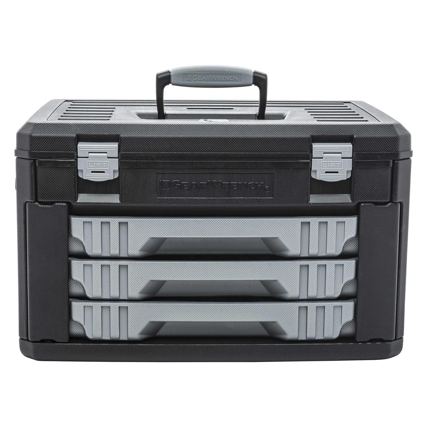 • Includes 3-Drawer Storage Box with independent sliding drawers, side flaps to lock drawers in place, a steel hinged lid and durable handle