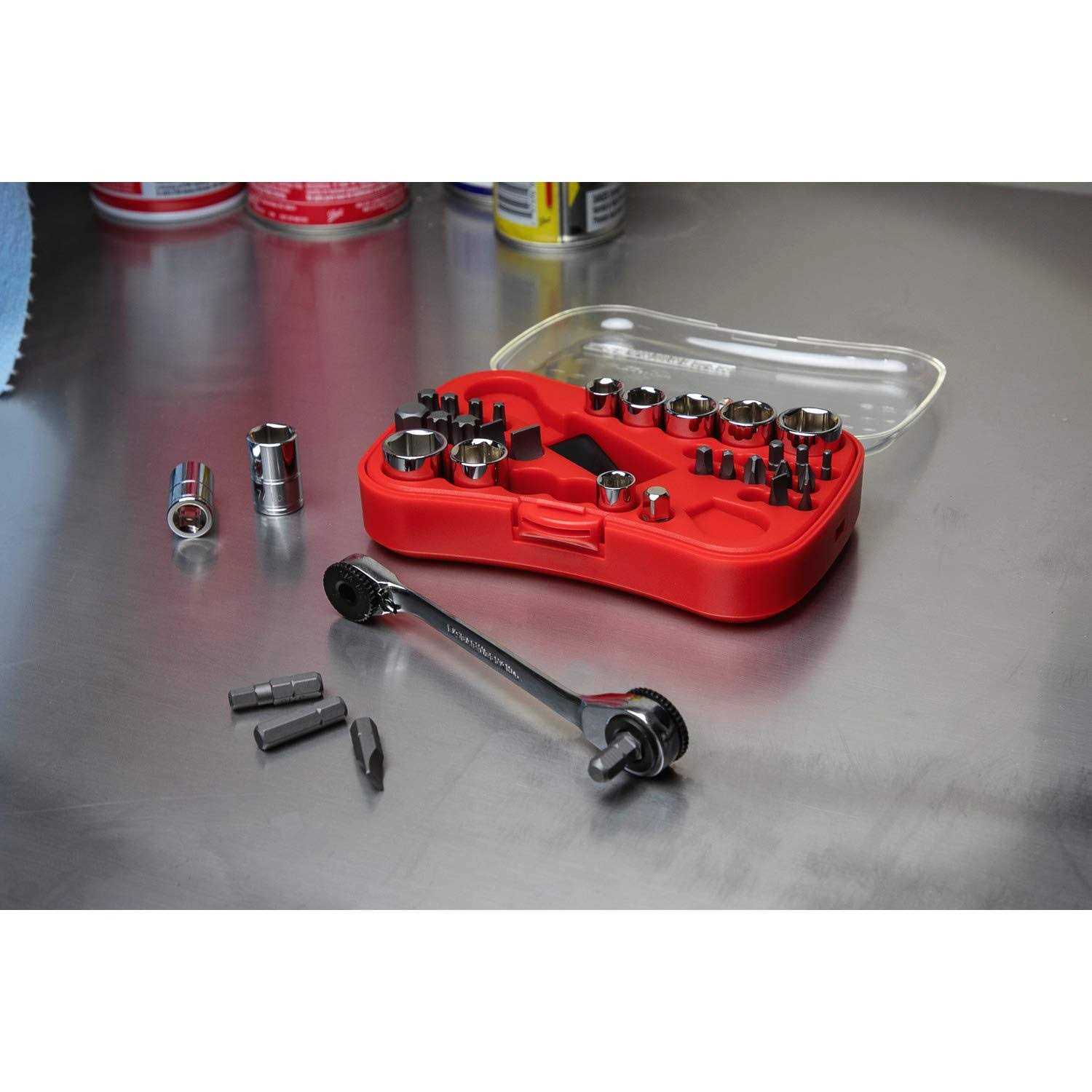 Set includes MicroDrive Gear Wrench; square end 1/4 inch adapter; 5 piece 6 point metric socket set; 5 piece 6 point standard socket set; 18 piece 1/4 inch shank bits set and 5 piece 5/16 inch shank bits set Set is made from all metal construction of the finest tool steel Tools have a full polish chrome finish for long tool life Screwdriver bits have internal bit feature which forces bit surface to the opposite side for maximum fastener retention Blow molded carry case has a spot for each tool for safe storage and easy access From the manufacturer GEARWRENCH 85035 35 Piece MicroDriver Set The GEARWRENCH 35 piece microdriver set offers a variety of sockets and bits with a ratcheting microdriver wrench for working in close quarters. The ratcheting microdriver has a fine ratcheting movement making short work of loosening or tightening fasteners. The compact blow mold case gives easy access to all parts. About GEARWRENCH GEARWRENCH produced the original five-degree ratcheting wrench in 1996 and quickly became a go-to brand for professional automotive technicians. The innovation didn’t stop there. Year after year, the GEARWRENCH brand continues to expand its line-in ratcheting tools and beyond-to help automotive and industrial technicians get their jobs done faster and easier. Set Includes: 5 In. ratcheting microdriver 1/4 In. square drive adapter 5 piece 1/4 In. drive 6 point SAE socket set 5 piece 1/4 In. drive 6 point metric socket set 18 piece 1/4 In. hex shank bit set 5 piece 5/16 In. hex shank bit set