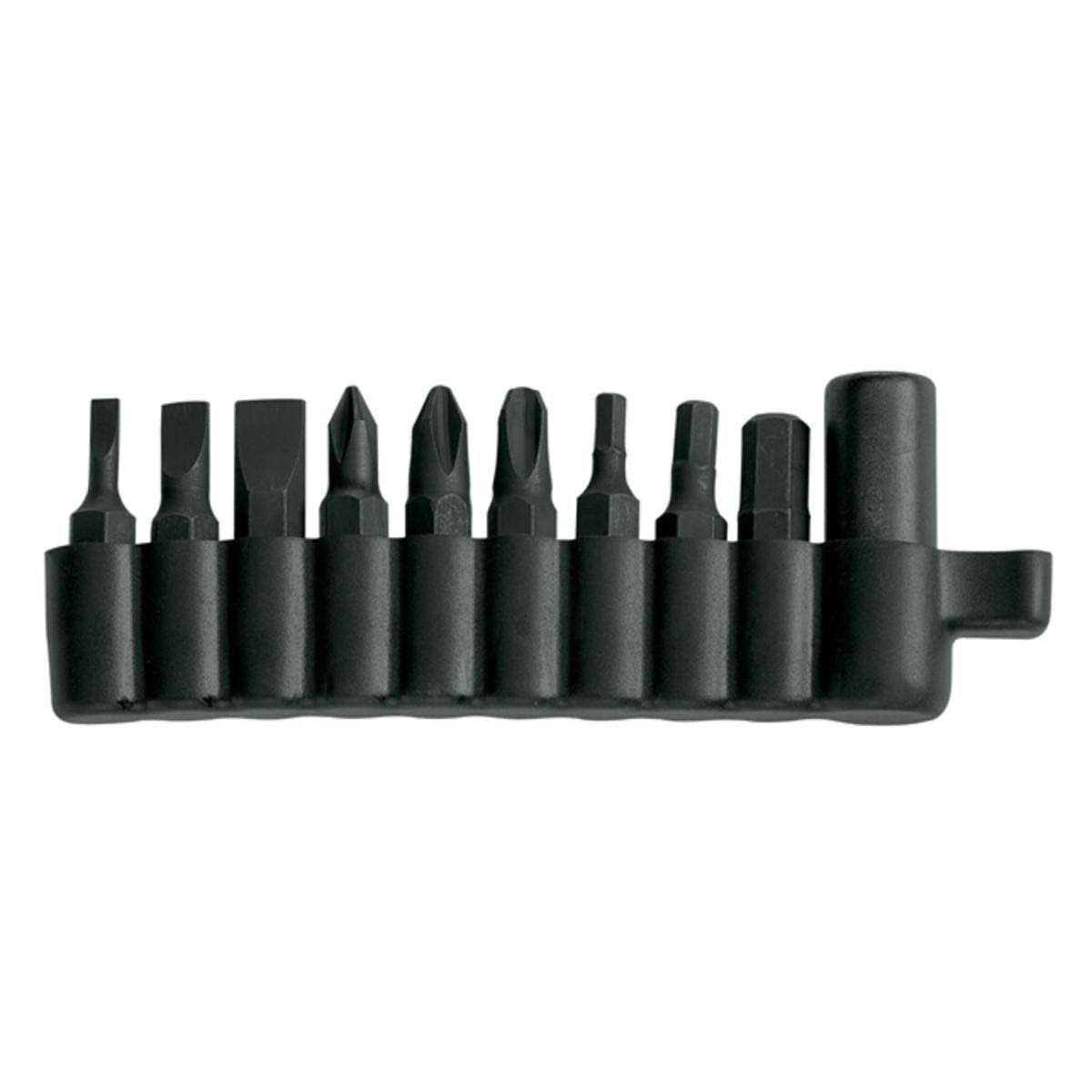 - Contains an adapter, three different sizes of flathead bits, cross point bits, and hex head bits, respectively