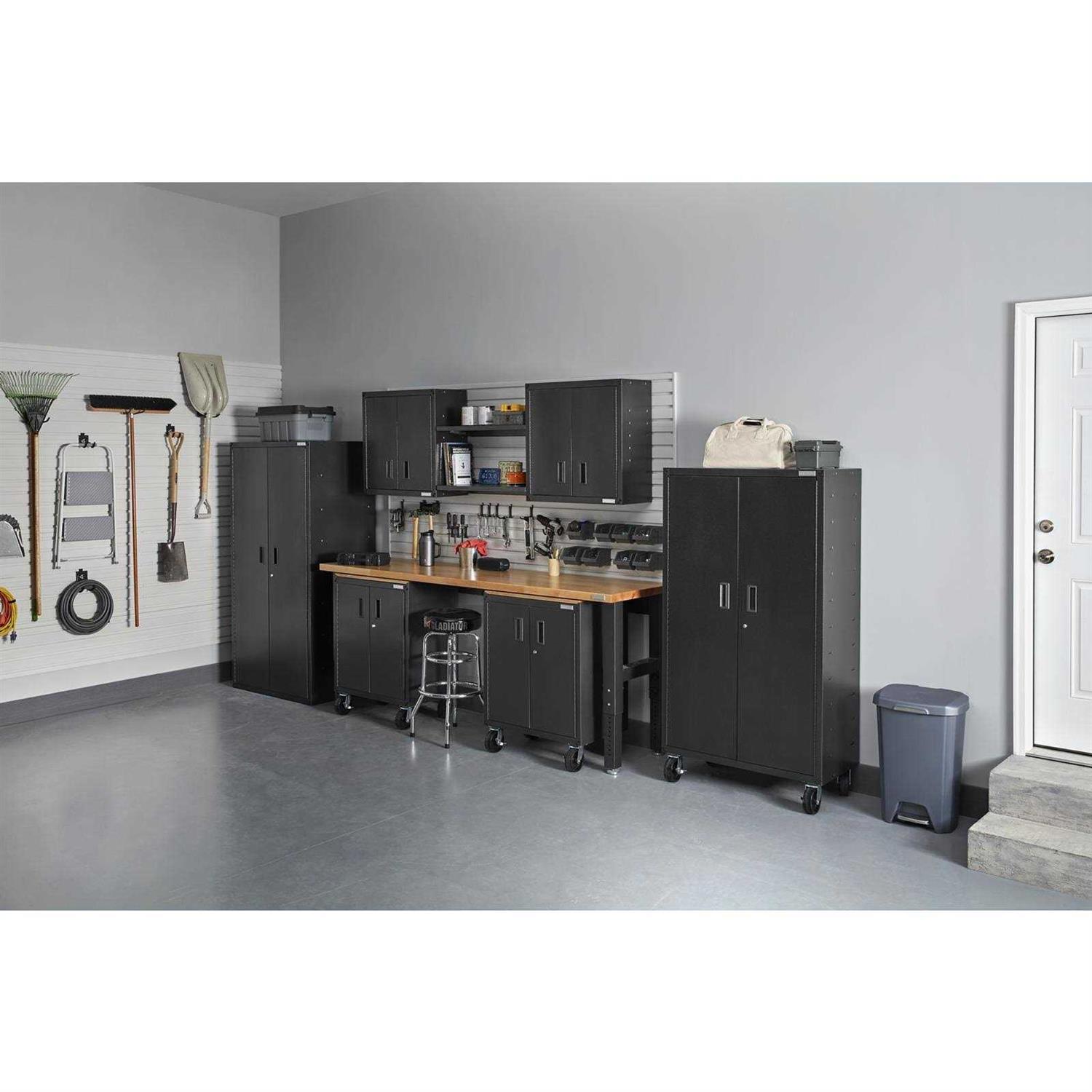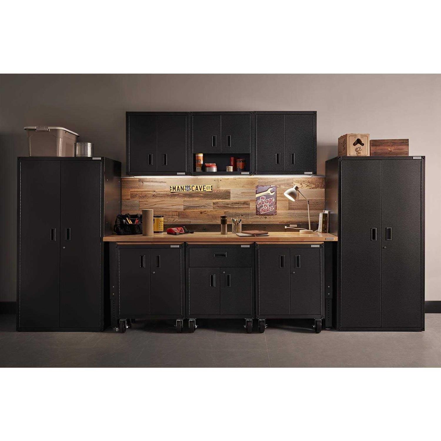 Count on the 8′ Adjustable Height Hardwood Workbench with Hammered Granite Finish for those projects that require brawn. The heavy-duty steel legs are as tough as they look, and the robust 1-3/4″ hardwood top supports up to 3,000 lbs to provide a sturdy foundation to build upon. Add a stool or coordinating Modular GearBoxes for an even more versatile workspace. While other manufacturers make claims about weight capacity, strength or durability, Gladiator brand proves it with some of the industry’s most rigorous testing regiments to ensure unsurpassed performance in any environment.