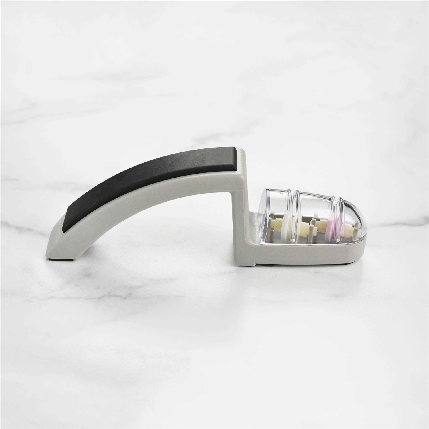 - Two-stage, handheld ceramic water stone sharpener for a complete sharpening process.