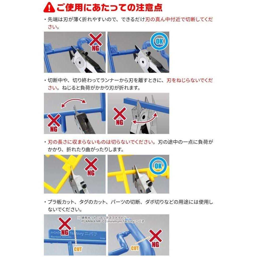 These Godhand nippers were designed for cutting parts and pieces off of injection molded frames. They can cut through plastic runners and gates (or sprues) with total ease. Their special design cuts down with an ultra-thin single blade that shaves through the plastic, rather than pinching it. This helps to avoid the white, stressed plastic and burrs that typical nippers can cause. These nippers are considered the gold-standard for people who put together plastic models. Hobby communities for model airplanes, Gunpla, and Warhammer swear by the Godhand SPN-120 nippers as the best around. They can cut through PP, ABS, and PE resin plastics up to 3mm thick, and PS resin up to 1mm thick. They’re not designed to cut through metal, wire, or wood, as it could damage the blade. These nippers were designed with absolute sharpness in mind, and to achieve that, the blade has become extra-thin. This means it can be very fragile, and you should take care not to misuse, drop, or twist the nippers while cutting.
