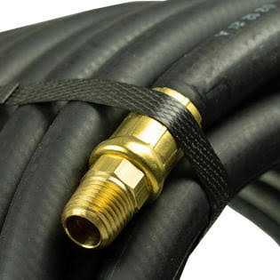 Weather, oil, and solvent resistant outer coating. Solid brass, 1/4″ NPT end fittings. Spiral synthetic yarn reinforcement. Maximum operating pressure – 250 PSI. Maximum burst pressure – 1070 PSI.