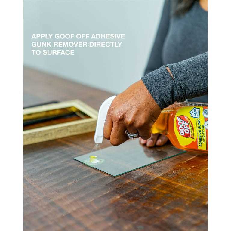 - Goof Off Adhesive Gunk Remover works the first time, removing sticky messes from glue, adhesives, and other adhesive gunk