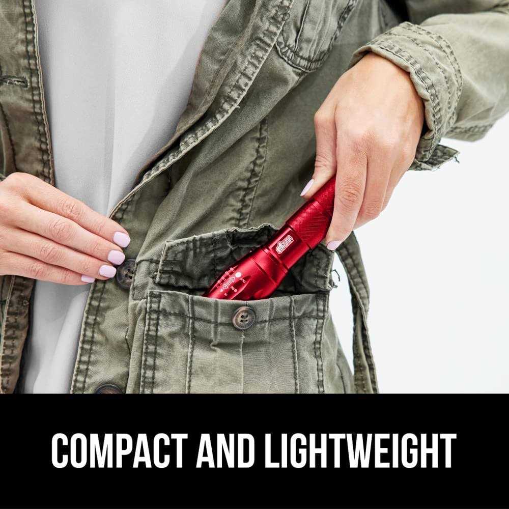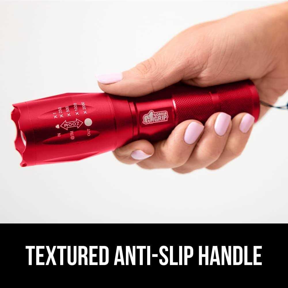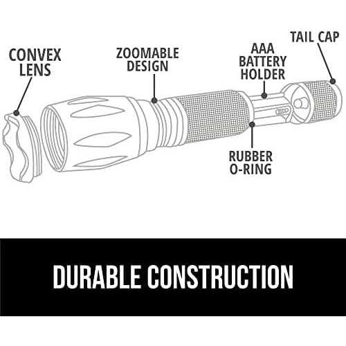 TESTED FOR POWERFUL BRIGHTNESS: featuring more lumens, this LED flashlight will surprise you; compact and lightweight, but ultra bright, it features 345 lumens that reach over 750 feet to shine bright and shed more light; others may claim to have high lumens, but our numbers have been uniquely engineered, tested and confirmed; powered by (3) AAA batteries; batteries not included FIVE MODES: includes a tap button that lets you easily switch between five modes; high, medium, low, strobe and SOS; lightly tap the button to jump between the modes, or firmly push the button to quickly turn on or off without having to cycle through each setting EXTREMELY DURABLE: all weather, ultra durable aluminum alloy flashlight is shock resistant, water resistant, and temperature resistant; the perfect option for any outdoor activity; take it with you hiking, camping, biking and more; flashlight is tough enough to sustain accidental drops up to 3.3 feet as well as water submersions; includes a run time of up to 9.5 hours ADJUSTABLE AND ZOOMABLE FOCUS: the zoomable design includes a wide to narrow beam zoom that makes it easy to focus on objects close or far away; simply twist the flashlight to adjust the zoom COMPACT DESIGN AND TEXTURED ANTI SLIP HANDLE: measuring 5 inches by 1.5 inches by 1.5 inches, flashlight is light and compact for on the go; ergonomic, anti slip textured handle makes it easy to hold and use Meet the ultra-durable, all-weather Gorilla Grip Flashlight! Featuring five modes and an adjustable zoom focus, this flashlight is ultra powerful. Even though it features 345 lumens, it is still light and compact enough to fit inside your pocket. Shock-resistant and water-resistant, with a run time of 9.5 hours, the flashlight will become your new best friend.