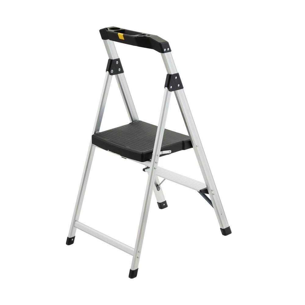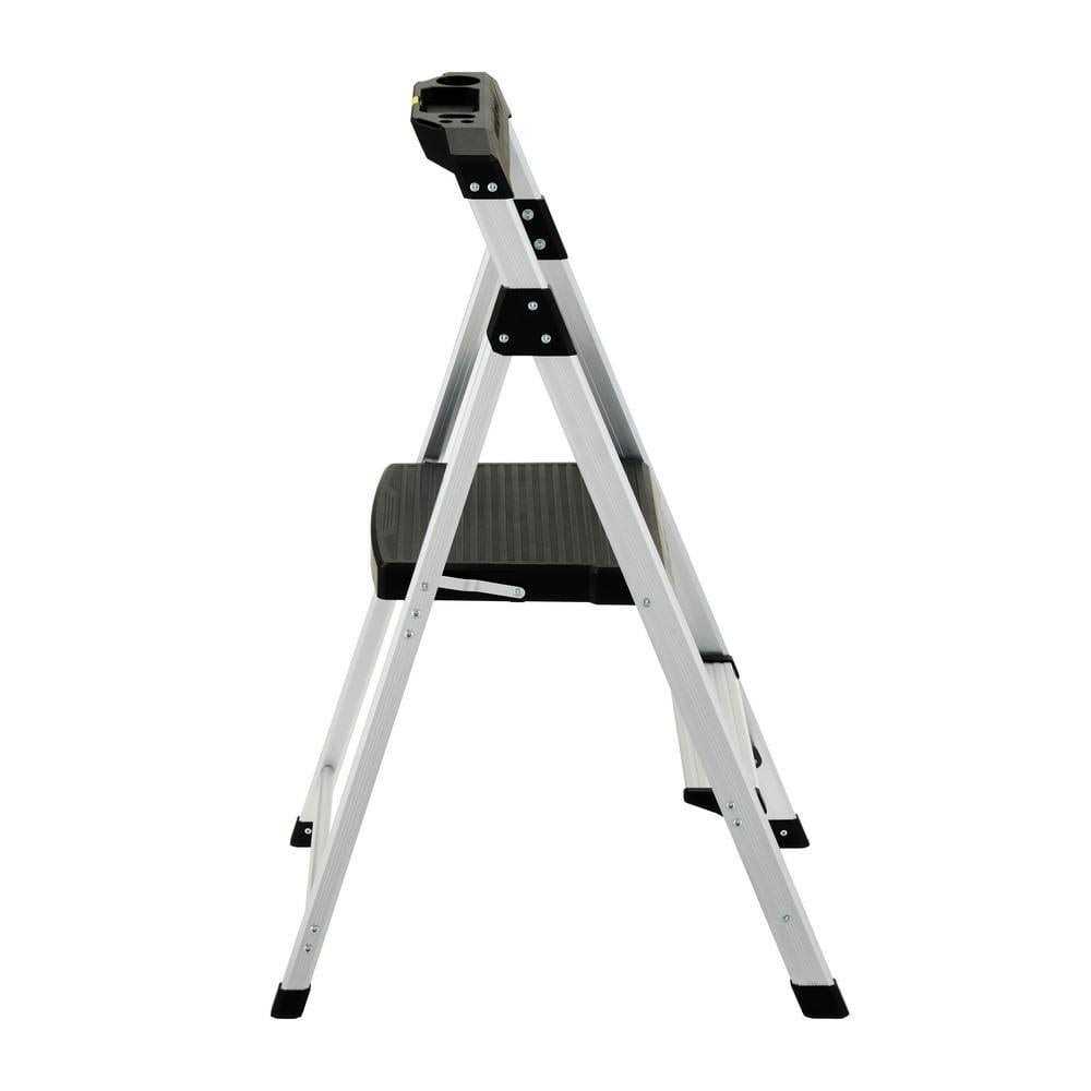 2-Step Aluminum Step Stool Ladder, 250 Lbs. Type I Duty Rating Lightweight aluminum weighs just 6 lbs. with a 250 lb. capacity. The built-in utility tray is perfect for holding tools, paint and hardware and comes in handy when cleaning, changing light bulbs, painting trim, hanging pictures or completing any other household project.Ladder Type: Step Stool Material: Aluminum: 90-Day Storage Width (in.): 17.75 Features: Foldable, Lightweight, Non-Marring Feet Ladder Rating: Type 1 – 250 lbs.Rung/Step Material: Plastic Product Weight (lb.): 6.4 lb Load Capacity (lb.): 250 lb.Number of Steps: 2: Limited Lifetime Certifications and Listings: ANSI Certified, OSHA Compliant Base Spread (in.): 25 in Rung/Step Depth: 13 Storage Height (ft.): 3.55 Reach Height (ft.): 8.17 Step Rise (in.): 10 Industry Standard Ladder Height (ft.): 3.5 Storage Depth (in.): 3.25.