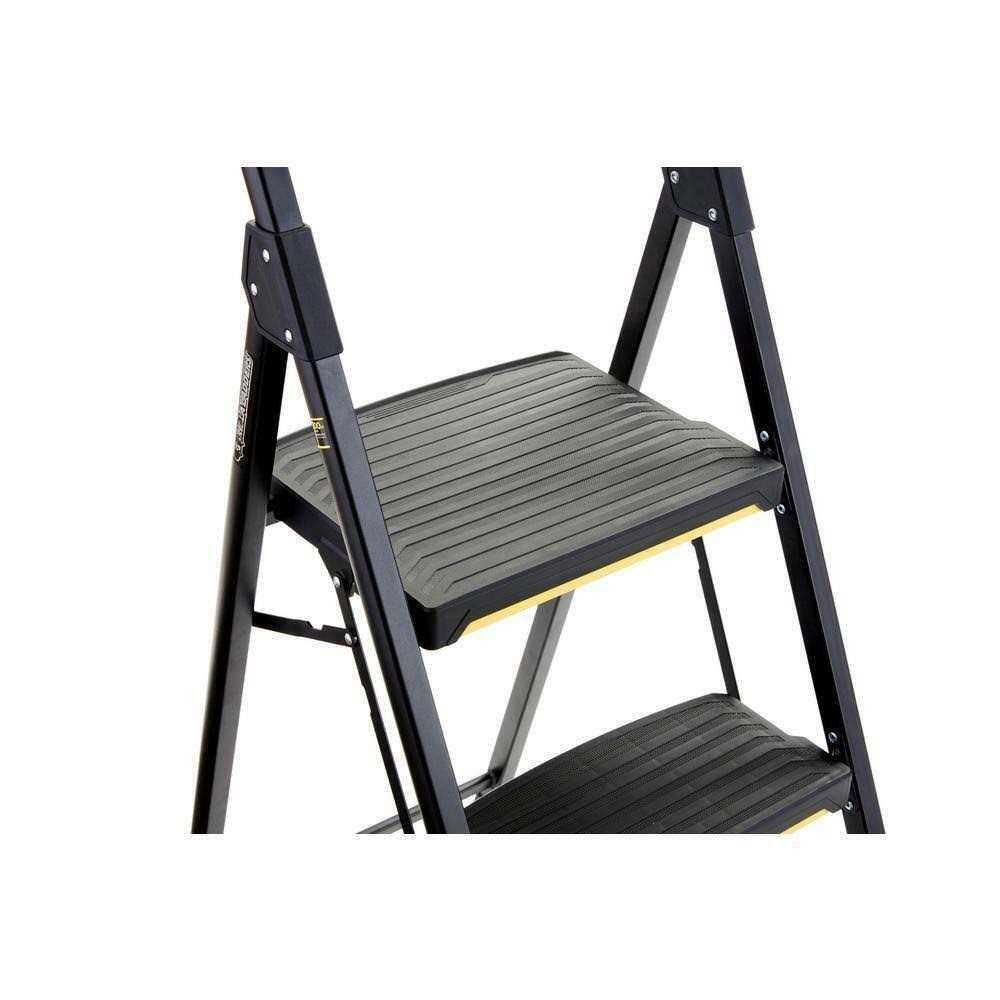 The newly-designed Gorilla Ladders 3-Step Pro-Grade Steel Step Stool is designed for toughness and dependability that help you get the project done. The sturdy steel construction and oversized steps combined with a 300 lbs. load capacity provide stability, comfort and safety. The convenient built-in project top is perfect for holding your hardware and tools and the non-slip treads and large, non-marring feet will keep you feeling secure on the ladder.