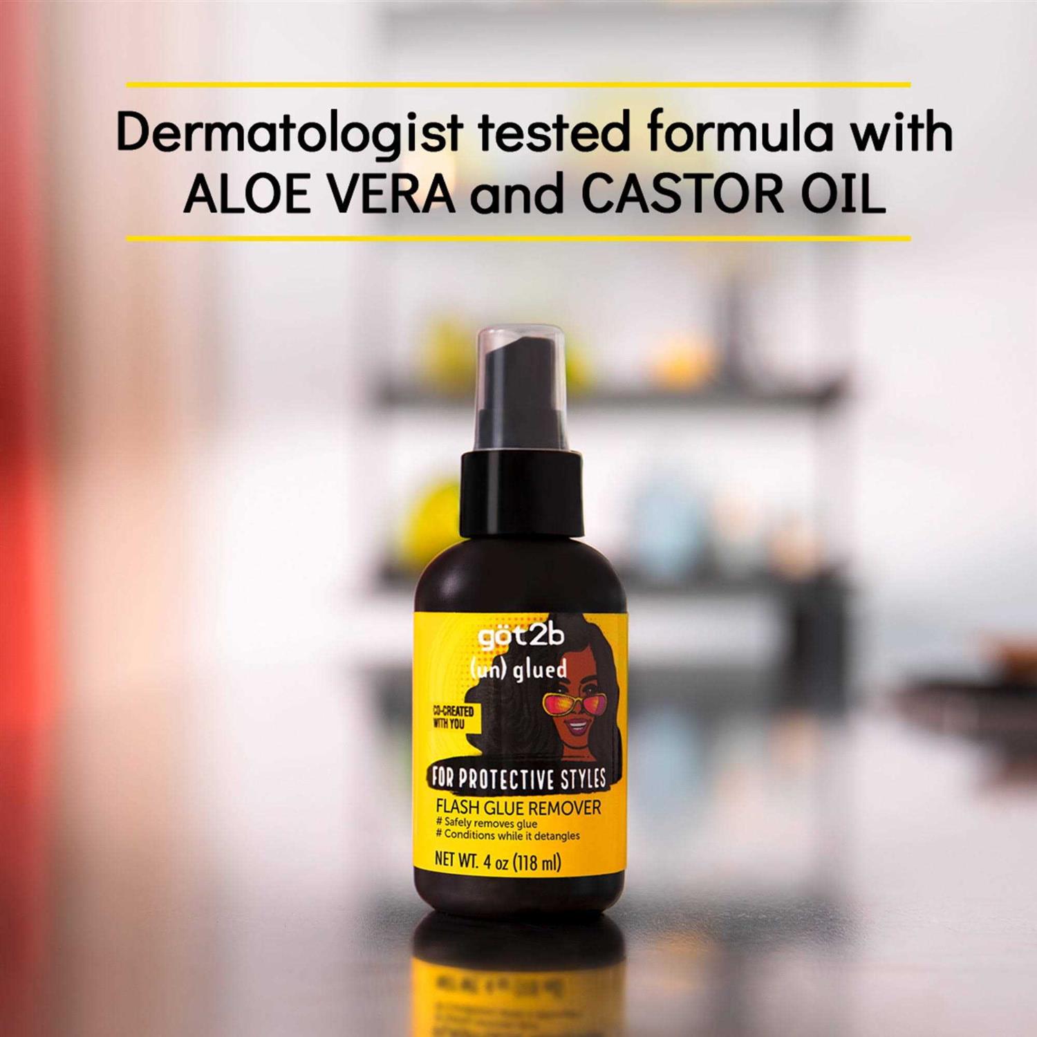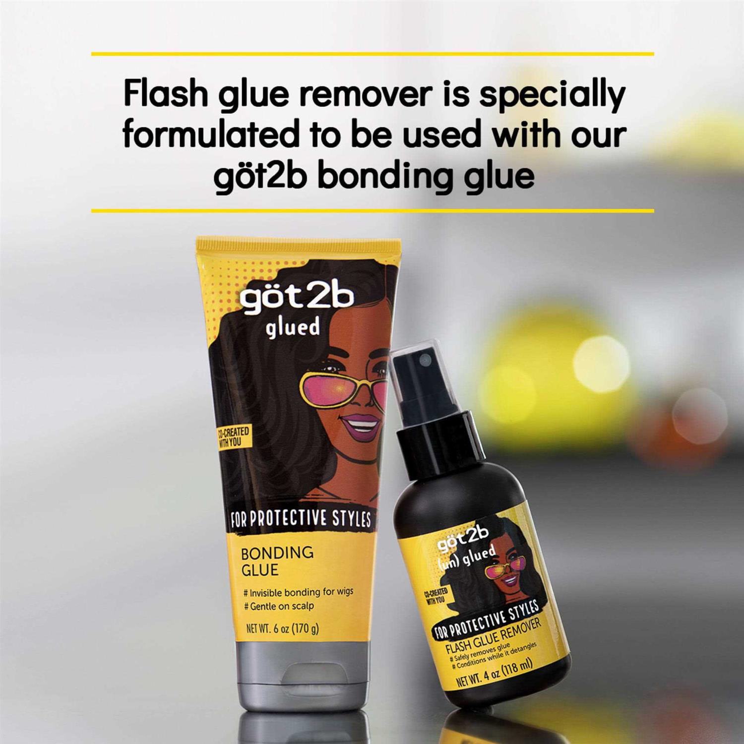 Got2b Flash Glue Remover is designed to remove got2b Glued Bonding Glue safely and easily in a flash while it also conditions & detangles when sprayed on natural or synthetic hair. Specially formulated to be used in conjunction with our got2b Glued Bonding Glue. This Glue Remover Spray is easy to apply and is safe for skin, scalp and edges and does not damage scalp. Can be used on Protective styles and wigs and for human and synthetic hair. Saturate a cotton ball with Flash Glue Remover. Dab on areas where glue was applied. Wait 1-2 minutes. Gently lift wig.
