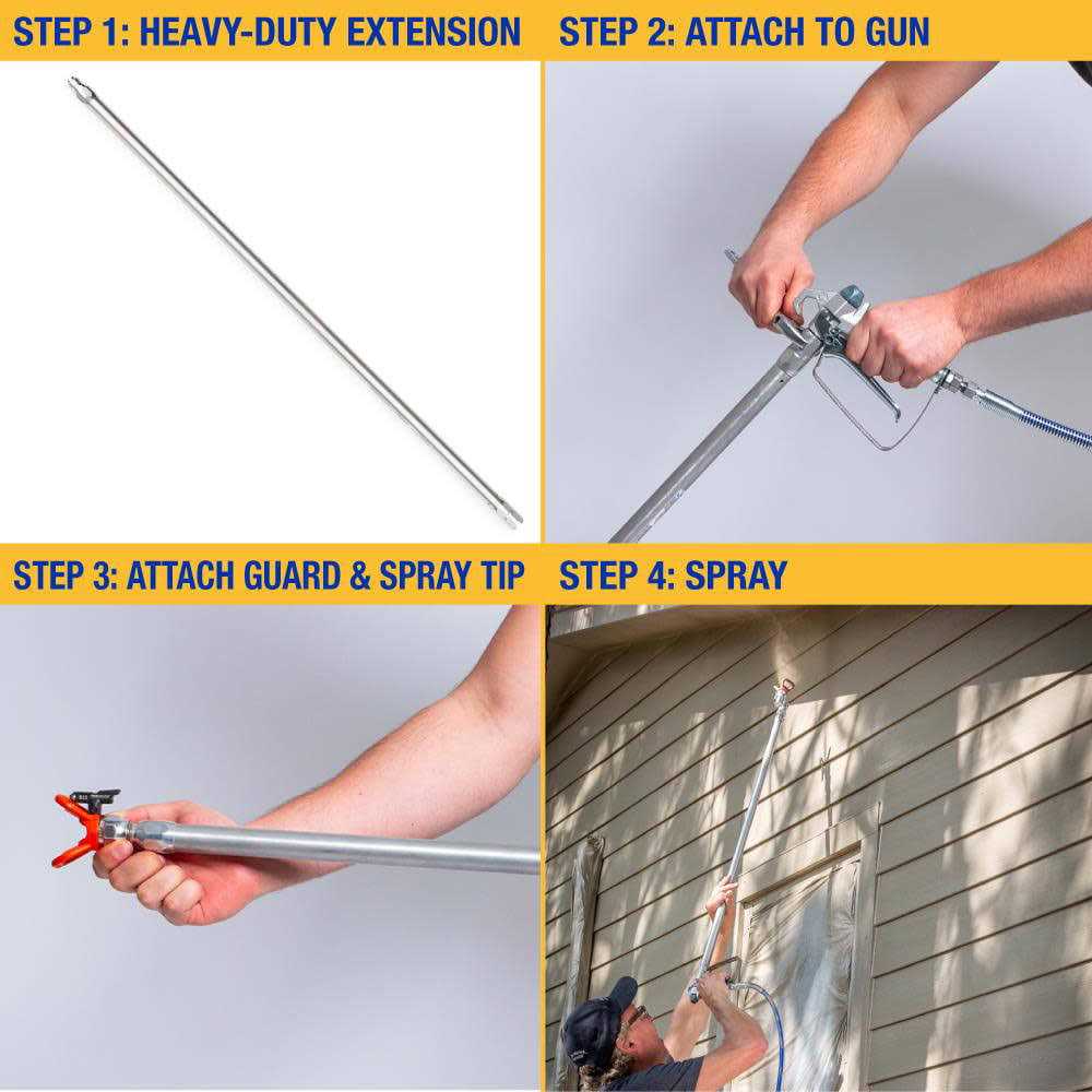 Attach the tip extension directly to your paint spray gun allowing you to extend your reach! Tip extensions are great for painting hard-to-reach areas such as decks, overhangs, high walls and soffits. The heavy-duty extension is ideal for pressure rolling applications. Connect multiple extensions together for further reach.