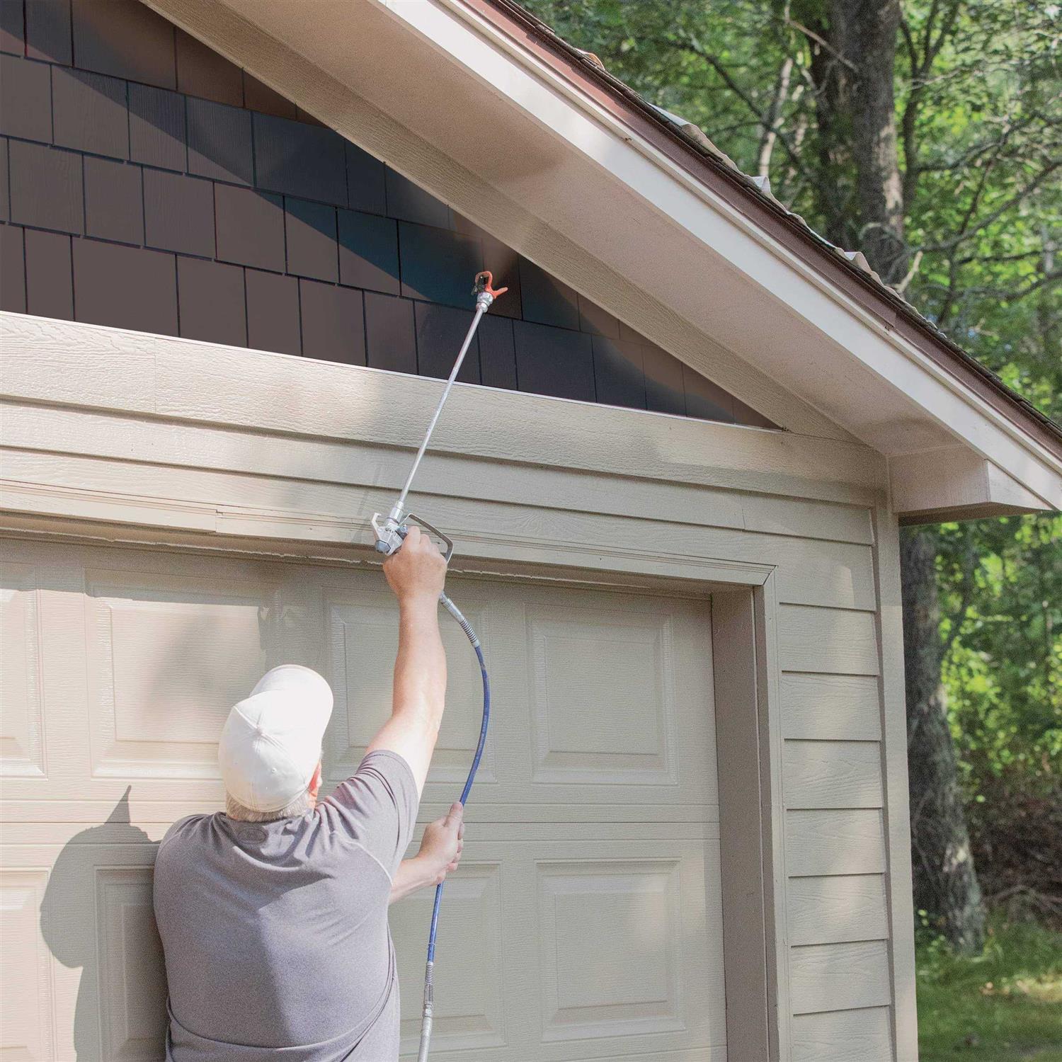 - Spray high, low or recessed areas like ceilings, stairways, soffits, high walls, overhangs or decks reducing the need for ladders or stepstools