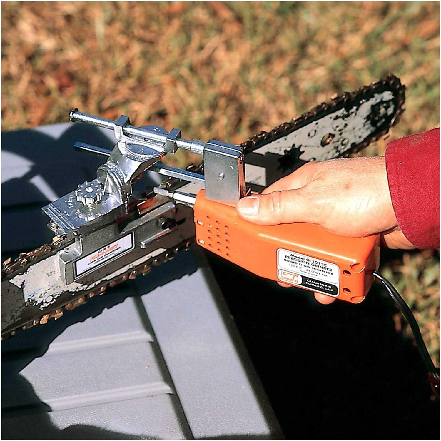 The 24, 000 RPM grinder features a Kevlar reinforced drive belt, high speed micro ball bearings, and heat-resistant polycarbonate case. Adjustable dials and thumb nuts allow you to set precise sharpening angles and grinding depths. The sharpener’s 8′ power cord features alligator clip ends for attachment to any 12V battery to sharpen chains at the job site. Included with the sharpener are two grinding wheels (7/32” and 1/4”) and instructions.
