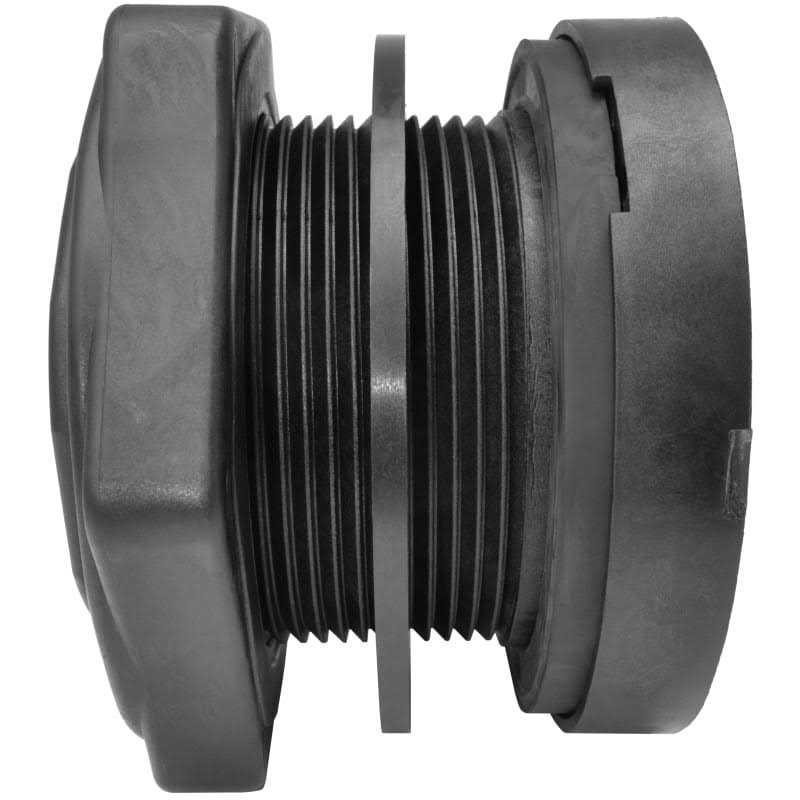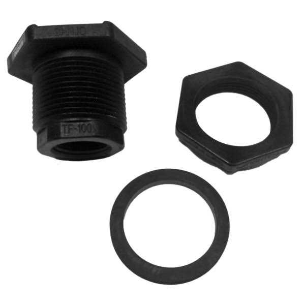 Left hand external thread and nut, FPT internal thread, for use with tanks having a wall thickness of 1/16 to 1/2 in. Polypropylene body and nut, polyethylene friction washer, EPDM sealing washer. The tank fittings are non-food-grade. EPDM sealing washer. EPDM sealing washer.
