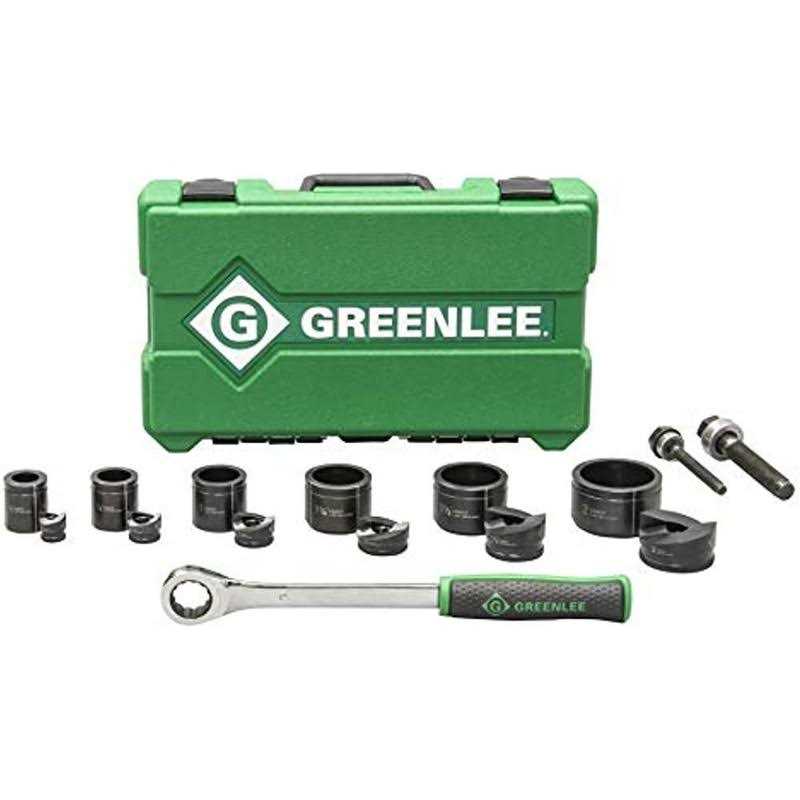 New Greenlee high-leverage wrench with 5-Degree ratcheting mechanism Slug-Buster punch profile splits slugs for easy slug removal Knurled edge on punches for better grip Laser markings for quick part identification Alignment markings for improved accuracy Easy threading – draw studs with “dog point” tip helps eliminate cross-threading Punch up to 10 Gauge mild steel 1/2 in. – 2 in. conduit size knockouts (hole