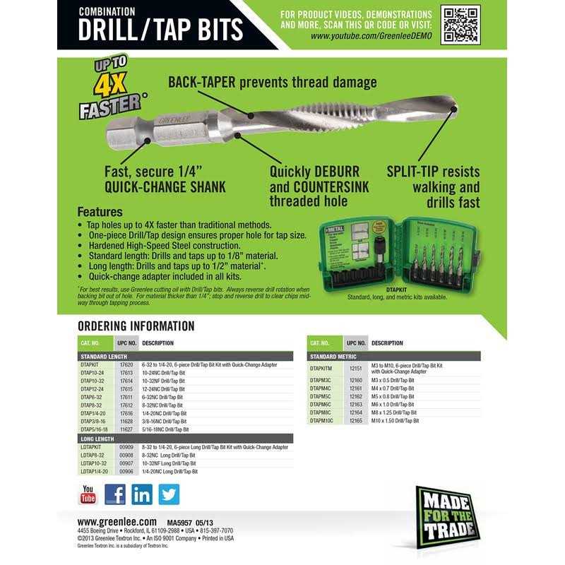Greenlee long drill/tap bits expand the performance of this popular product line. Drill, tap and countersink up to 4X’s faster than traditional tapping methods. Tap up to 1/2-inch thick mild steel, copper, brass and aluminum. Long drill/tap bits are a great addition to our standard length drill/tap bits which can tap up to 1/8-inch thick material using 6-32 to 1/4-20 standard threads and M3 to M10 metric threads.