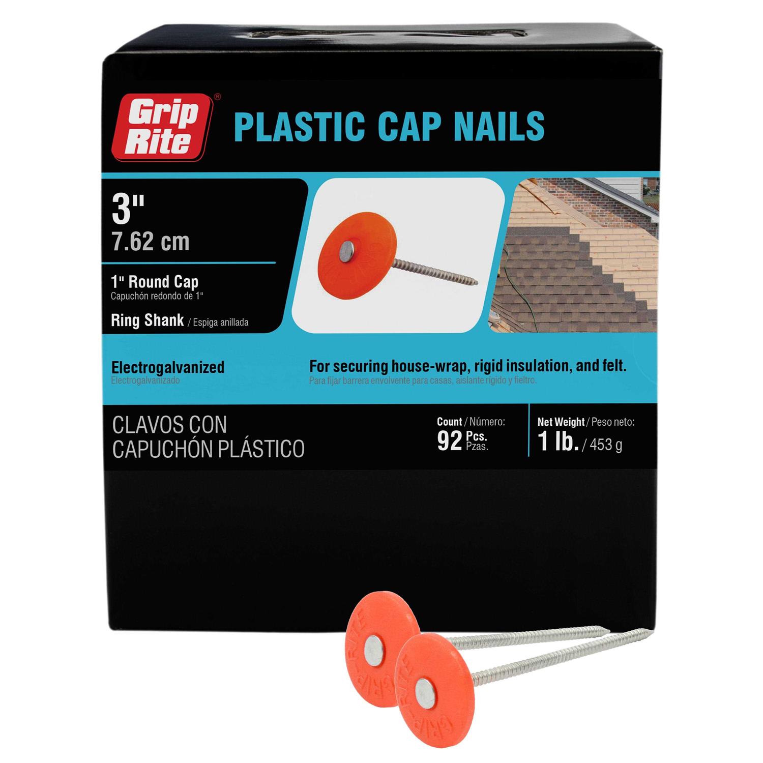 These Prime Source 1.15 lb Round Plastic Cap Nails are ideal for anchoring sheathing, housewrap and more. They feature a wide head and a ringed shank for more holding power. These electro galvanized nails have a 3 inch size.
