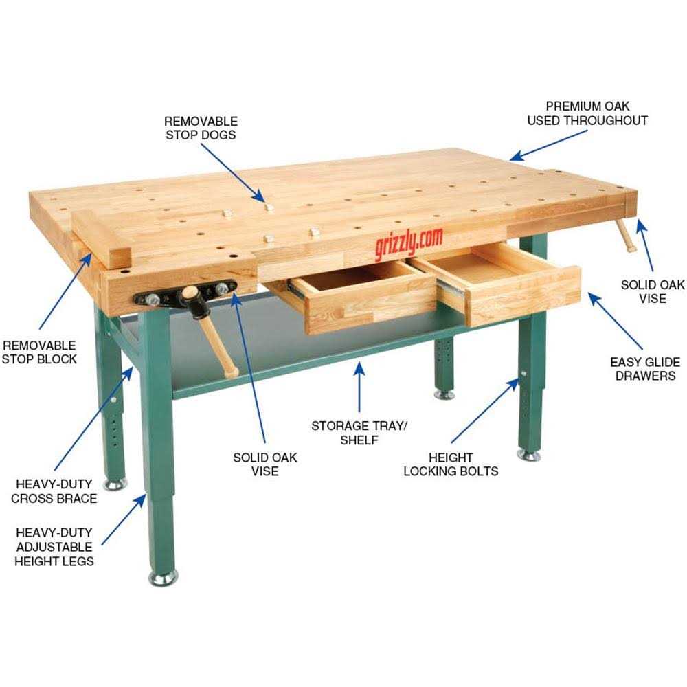 All wood surfaces have clear lacquer to show off the wood s natural beauty and the steel legs and shelf are Grizzly green to match your favorite machines. The top measures 60″ long x 30″ wide and the adjustable legs can be set so the height of the Workbench is 32″ to 39″ above the floor. The legs adjust in 1″ increments. The T10157 instructions sheet was written by our U.S. based Technical Documentation Department and is packed with useful information. The complete and easy-to-read instructions makes it easier to assemble and maintain your workbench.
