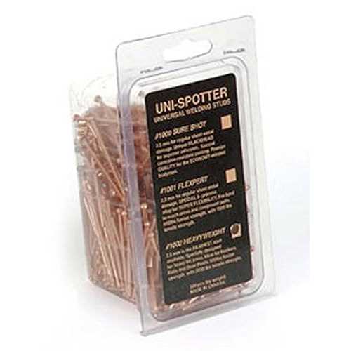 Heavy weight Uni-Spotter Welding Studs 2.6mm the heaviest stud available. Specially designed for heavy hit areas. Ideal for rockers rails and door posts. 500 lbs. fusion strength with 2000 lbs. tensile strength. Dimensions: 6.0 L x 3.3 W x 2.7 H.