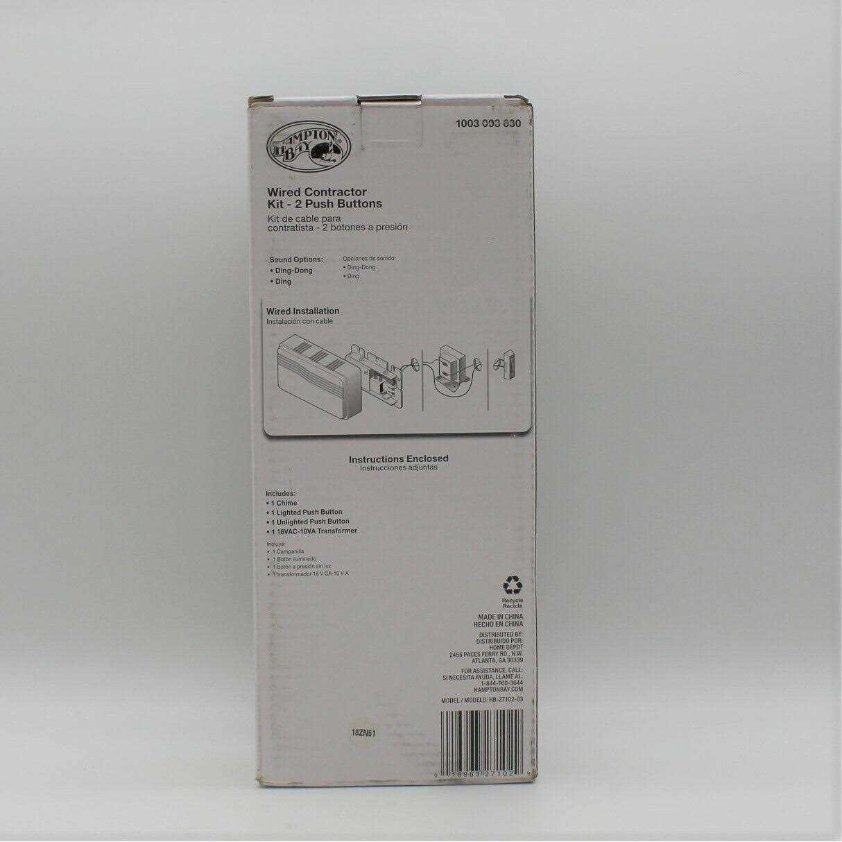 The Hampton Bay Branded Wired Door Chime Contractor Kit includes a 2-tone doorbell chime 1 lighted and 1 unlighted white push button and a 16-Volt 10-Watt transformer. This complete doorbell kit is perfect for new installation. Complete instructions are included with the kit. White door chime cover Use with any wired push button 85dB maximum loudness Chime can be mounted vertically or horizontally to the wall Install with bell wire (sold separately)