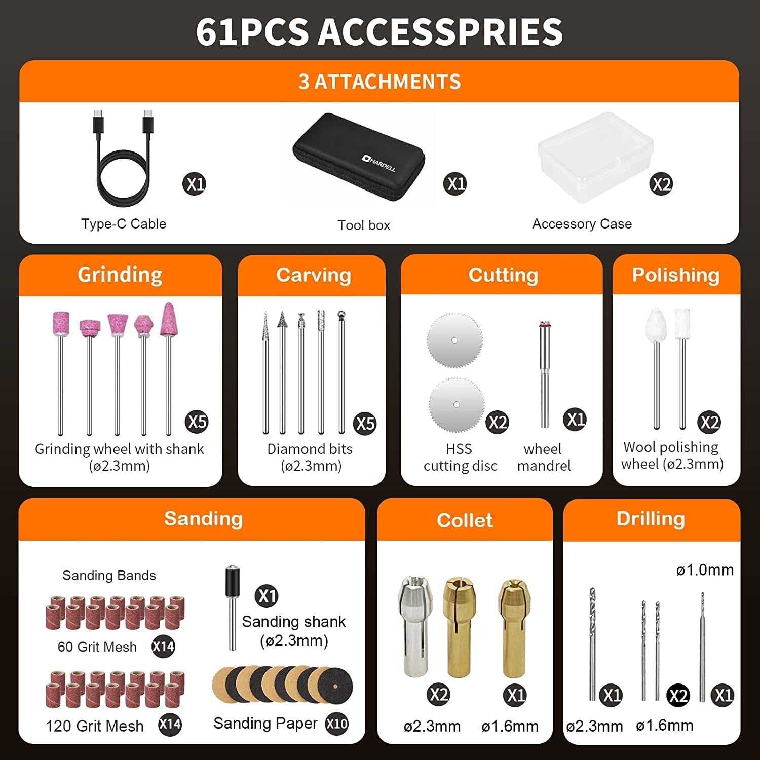 【Versatile Rotary Tool Set】This rotary tool set includes a high-performance and low-noise rotary tool with 61 of the most popular power rotary tool accessories for fine DIY work. Ideal for carving, sanding, grinding, polishing, or cutting, this electric rotary tool is perfect for creating resin crafts. It’s like having a whole toolbox in one convenient package. Note: Not suitable for heavy-duty projects 【5-Speed Settings】The cordless rotary tool has 5-speed adjustments (5000/8000/11000/14000/18000RPM) for easier speed control and to meet the power demands of different tasks. This allows for safe and careful sanding in stages, even for beginners who can easily control the speed. With the micro rotary tool, your creations are always handy 【Compact and Lightweight】This rotary tool is powerful yet small and light, giving you ultimate control and precision, as well as comfort, just like holding a pen 【Quick USB Charging and Longer Running Time】The cordless rotary tool comes with a 3.7V rechargeable battery that can work continuously for 200 minutes. A single charge can be used multiple times, making it stress-free and convenient. Battery-powered rotary tool allows you to work one after another. (The indicator light will turn green when fully charged) 【Rotary Drill with LED Indicator】The upgraded small cordless rotary tool has a blind spot lighting LED design, which reduces backlight shadows and overcomes the adverse effects of dark areas on the use of the drill for resin. This provides you with a better experience and more precise work Product Description HARDELL MINI Rotary Tool is lightweight and small, you can carry it with you. It is suitable for different DIY working situation Product Features: Cordless design: Cordless design of the rotary tool allows use anywhere without the need for an electrical outlet. USB Charging: Equipped with a Type-c power cord, making charging easier and more convenient. Spindle Lock: Onboard spindle lock makes for quick and easy bit changes. Variable Speed Tool: With 5 different levels of RPM, which can be adjusted from 5000 to 18000 RPM. Easy to use: You can grip it like a pen for ultimate control and precision as well as for comfort. Ergonomic streamlined design with overload power-off protection for safe and reliable operation. Application: Fit for grinding pet nails and detailed works like sanding, polishing, carving, and cutting. Product Contents: 3.7v Cordless Rotary Tool and 61 Accessories(include USB) Cordless Rotary Tool with 61 pcs Accessories What you will get: Cordless Rotary Tool x1 Sanding Bands x28 Sanding Papers x10 Grinding Bits x5+ Diamond Bits x5 Collets x3 + Mandrels x2 Polishing Wheels x2 + Twist Drill Bit x4 + Cutting Disc x2 Accessories Case x2 Type-c Cable x1 Warning Not for Heavy-duty Projects Do not press the lock button until the tool fully stops, or it may cause damage or even injury. Please refer to the instruction manual for a detailed operation guide. Very useful for arts and crafts projects and small home repairs and are excellent for working in small or hard-to-reach spaces Specifications 1. Rating: 3.7V 2. 5-Speed: 5000/8000/11000/14000/18000RPM (no load) 3. Color: Orange 4. Collet Size: φ1.6mm/φ2.3mm diameter 5. Charging Port: Type-C 6. Tool Weight: 0.135kg 7. Tool Size: 3.4*17.5CM 5 Rotation Speed 5 Rotation Speed controlled, you can make the speed control finely by adjusting the tool to better complete the job. USB Charging Rechargeable via supplied compatible USB connector at any place, more convenience for your charging. Full charging time is about 2-4 hours, and the indicator light will turn green when it is fully charged. Easy to Use The cordless tool with φ1.6mm and φ2.3mm compatible collet and spindle lock allows you to quickly and easily change accessories on Rotary tools. (Please make sure the bits are fixed in the rotary tool every time) LED Working Light Featuring the built-in front LED light, projects are well-lit evenly and this illumination keeps perception of fine detail Installation Instructions Application Sanding Sanding belts and sanding discs can help your handmade crafts become smoother and smooth out the uneven surface of crafts. Such as steel rust, paint and rough wooden boards can be removed by the sanding rotary tool. Carving It is very easy to use for accurate DIY craft engraving on glass, wood, metal, plastic, mirrors, and other materials. You can engrave any pattern you like to create a unique gift for your family and friends. Drilling This Cordless Rotary Tool can be used for diamond drilling. Different sizes of drill bits and special cutting heads allow you to work easily on wood. Polishing Mini Rotary tools can help you remove rust from some metal surfaces. polishing Wheel and Abrasive Stone are suitable for polishing various materials. Reduce the surface roughness of the product to make its surface bright and flat. Grinding You can easily remove rust and polish the metal surface of the object to make the
