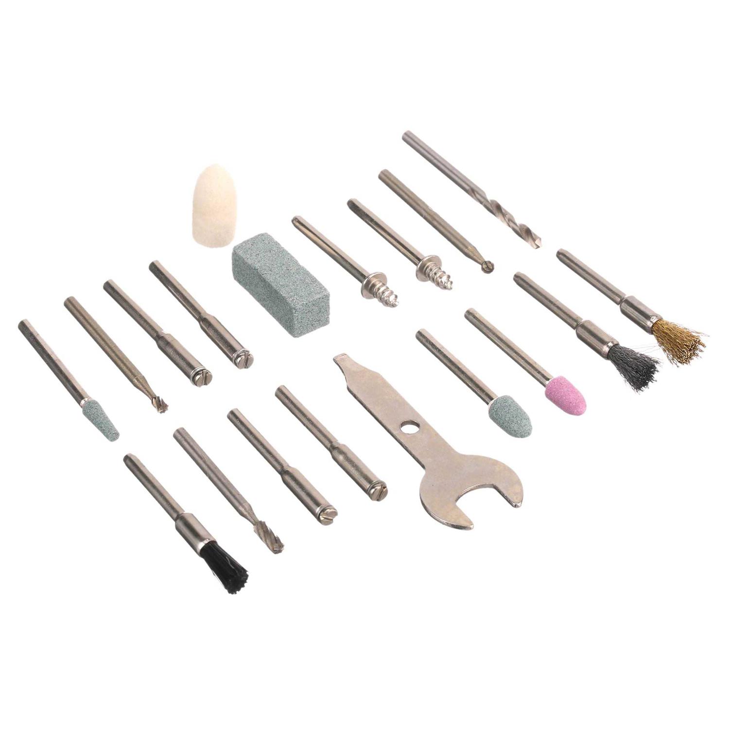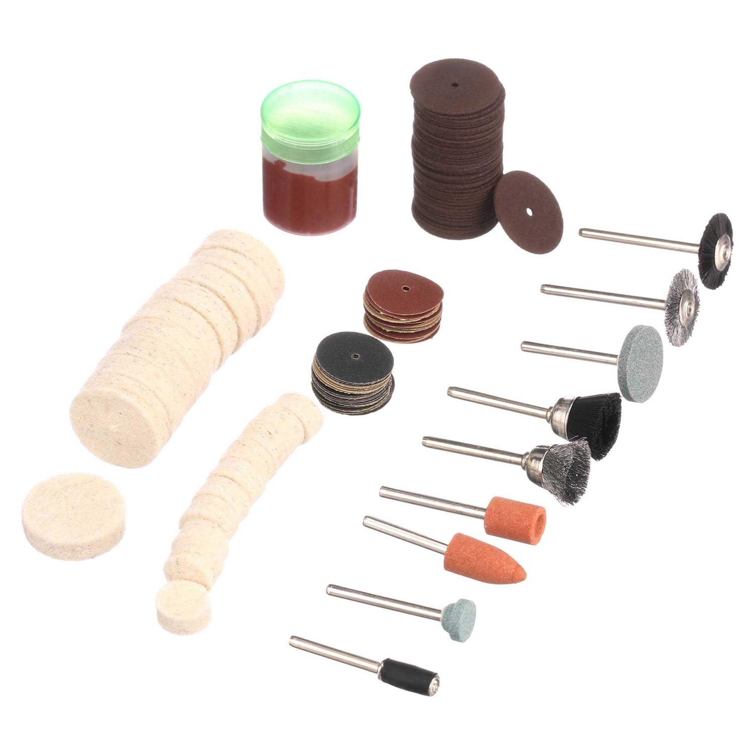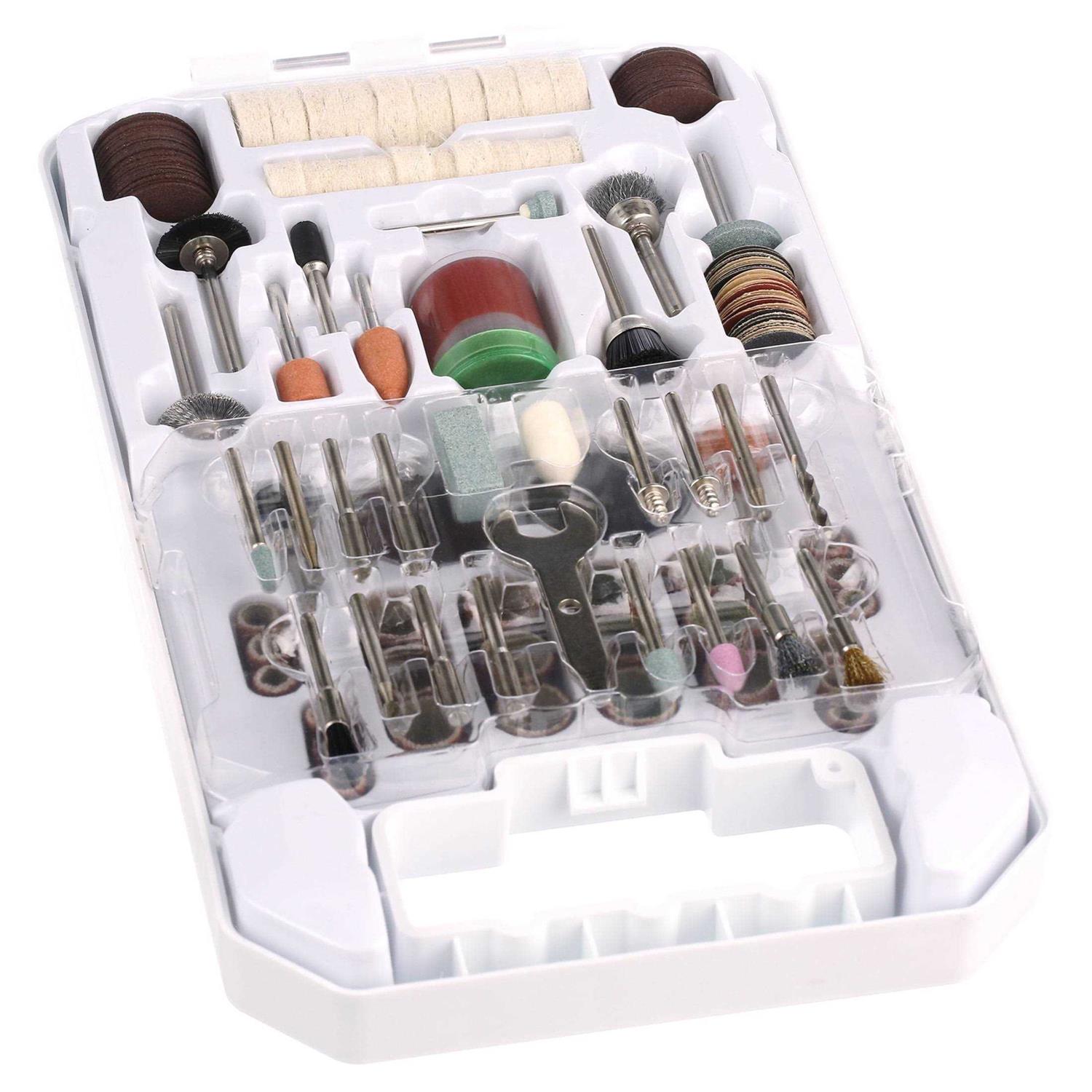 The HART high-performance rotary tool kit comes with all the accessories needed for grinding, polishing, sanding, cleaning and more. Ideal for The HART 20V rotary tools, these bits and accessories work on wood, metal, PVC and tile. Set includes sanding bands, wire & bristle brushes, polishing compound & wheels, felt wheels, grinding stones, drill bits, cutoff wheels sanding discs & drums, plus (1) mandrel, (1) wrench and more. All 175 pieces come in a hard plastic case. Includes: (1) 1/8 inch HSS Drill Bit (1) 1/8 inch High Speed Cutter (1) 1/8 inch Ball End High Speed Cutter (1) 5/64 inch Engraving Cutter (25) 15/16 inch Cutting Wheel 0.025 inch Thick (25) 15/16 inch Cutting Wheel 0.0625 inch Thick (5) 1-1/4 inch Fiberglass Reinforced Cut-Off Wheel 0.045 inch Thick (5) 1-1/4 inch Cutting Wheel 0.0625 inch Thick (1) 1/4 inch Sanding Drum (6) 1/4 inch 60 Grit Sanding Band (1) 1/2 inch Sanding Drum (6) 1/2 inch60 Grit Sanding Band (6) 1/4 inch 120 Grit Sanding Band (6) 1/2 inch 120 Grit Sanding Band (14) 3/4 inch 180 Grit Sanding Disc (13) 3/4 inch 220 Grit Sanding Disc (13) 3/4 inch 240 Grit Sanding Disc (10) 1 inch Felt Polishing Wheel (1) 3/8 inch x 1 inch Felt Polishing Cone (10) 1/2 inch Felt Polishing Wheel (1) Polishing Compound (1) 1/4 inch Aluminum Oxide Grinding Stone (1) 3/8 inch Aluminum Oxide Cone Shaped Grinding Stone (1) 3/8 inch Aluminum Oxide Cylinder Shaped Grinding Stone (1) 5/8 inch Aluminum Oxide Grinding Stone (1) 3/16 inch Silicon Carbide Grinding Stone (1) 9/32 inch Silicon Carbide Grinding Stone (1) 13/32 inch Silicon Carbide Grinding Stone (1) 25/32 inch Silicon Carbide Grinding Stone (1) Dressing Stone (1) 1/8 inch Nylon Bristle Brush (1) 1/2 inch Nylon Bristle Brush (1) 3/4 inch Nylon Bristle Brush (1) 1/8 inch Carbon Steel Brush (1) 1/2 inch Carbon Steel Brush (1) 3/4 inch Carbon Steel Brush (1) 1/8 inch Brass Brush (2) Mandrel (4) Mandrel with Screw (1) Wrench