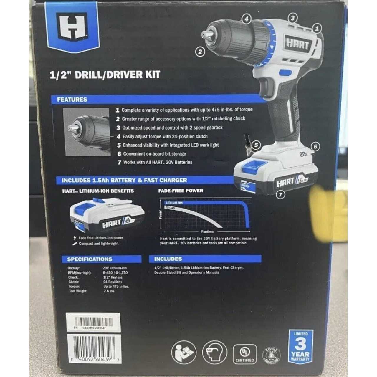 Hart 20-Volt 1/2-Inch Cordless Drill/Driver Kit, (1) 1.5Ah Lithium-Ion Battery, Gen 2