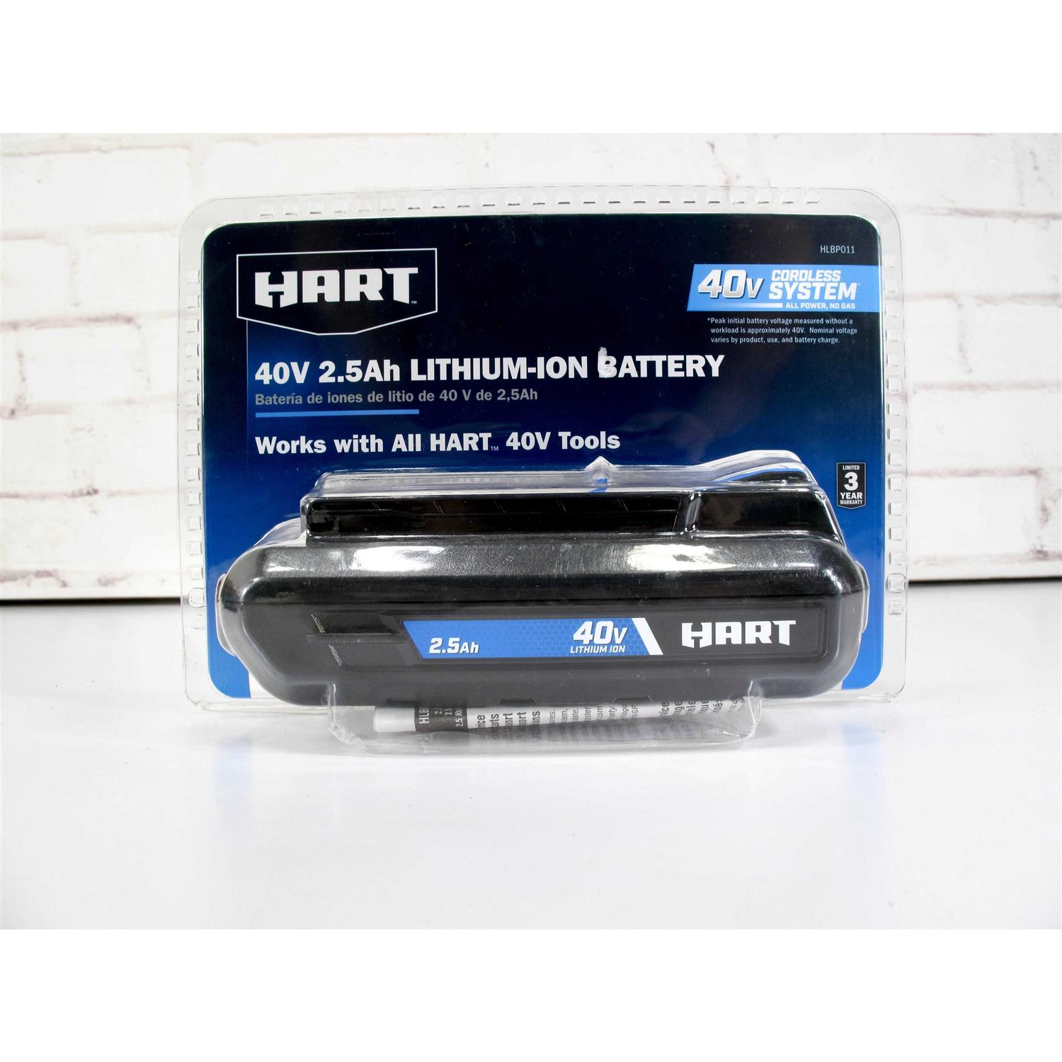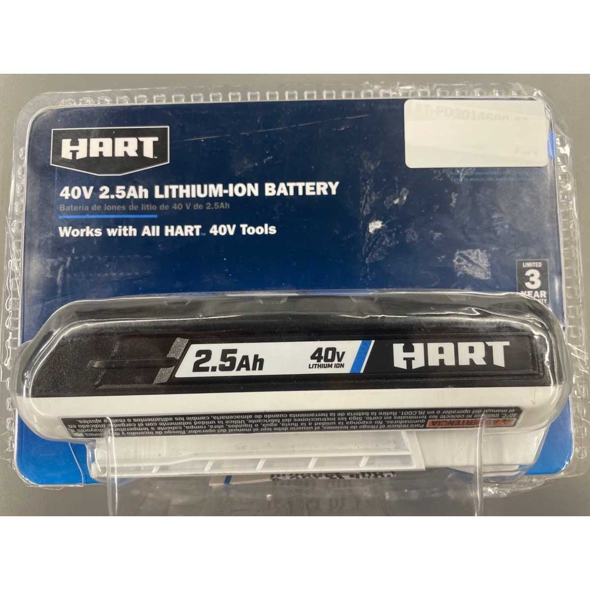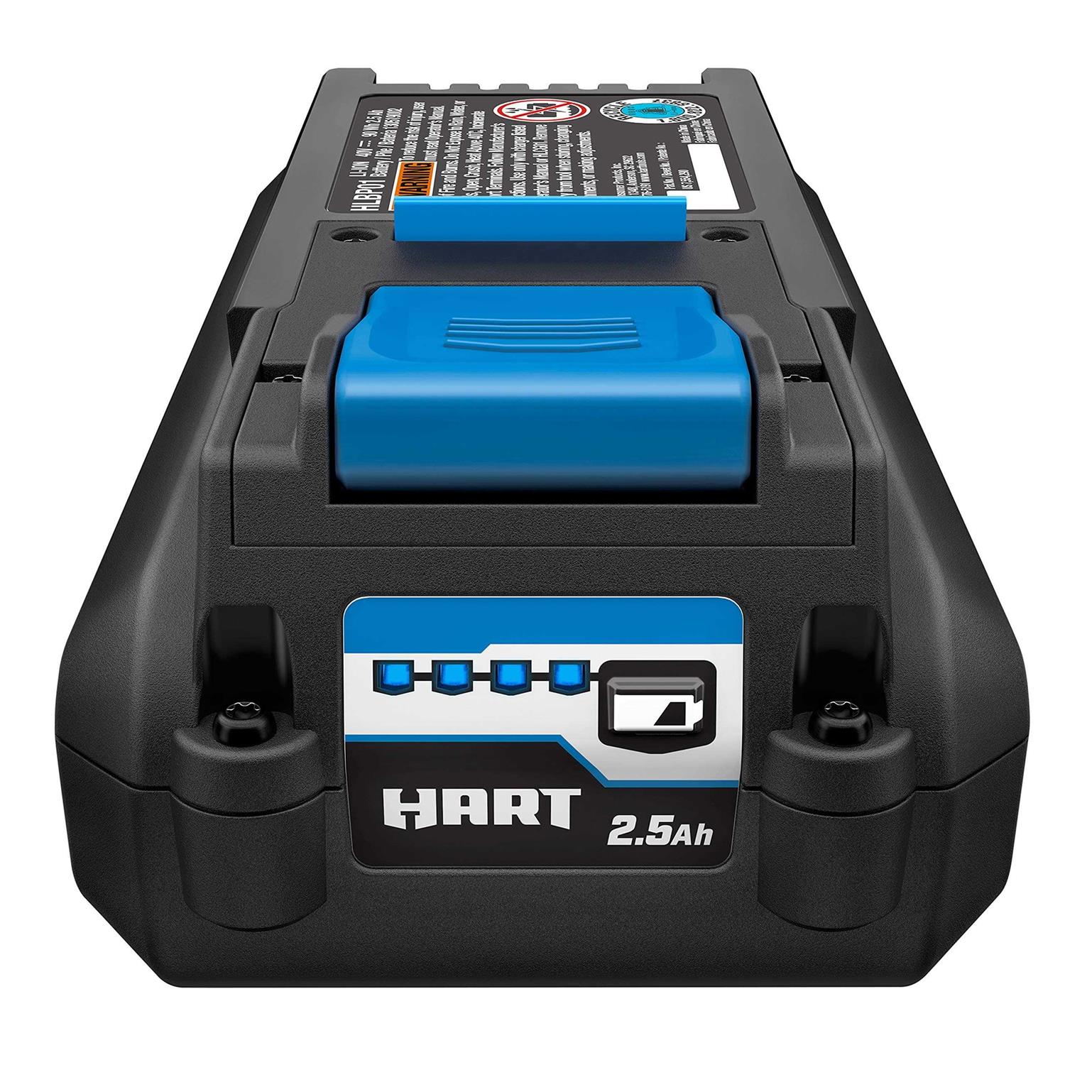 Expand your 40V collection with this powerful and compact 2.5Ah 40V HART Battery. This powerful battery features Lithium-Ion technology to give you long-lasting and fade-free power you need to tackle any project that comes your way. Also the On-Board Fuel Gauge allows you to quickly check the charge at any moment. The 2.5Ah 40V HART Battery has a slim design that lends itself to a more comfortable experience by reducing fatigue. This 2.5Ah battery is compatible with all HART 40V outdoor tools. You will never run out of runtime while having this additional HART Battery on hand Get ALL POWER NO GAS with the HART 2.5Ah Battery. This battery is sold as a single battery and does not include a charger or a tool.