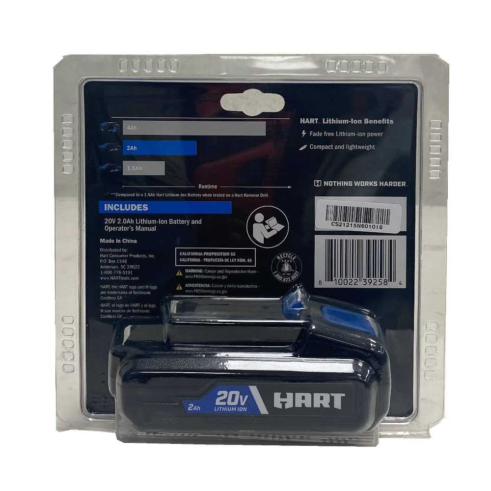 The HART 20V 2.0Ah Lithium-Ion battery is an excellent addition or start to any DIYers HART tool collection. This battery is compatible with all HART 20V power tools. It features Lithium-Ion technology to give you long-lasting and fade-free power to get you through any project you decide to take on. This battery is designed to be compact and lightweight for more maneuverability and while reducing user fatigue. Whether you are maintaining your yard with HART outdoor tools cleaning and maintaining your car with HART automotive tools or keeping cool and entertaining with HART lifestyle tools the HART 20V 2.0 Ah battery is there to provide the power you need when you need it with 1.25x longer runtime than the HART 20V 1.5 Ah Lithium-Ion battery. This battery is sold as a single battery and does not include a charger or a tool.