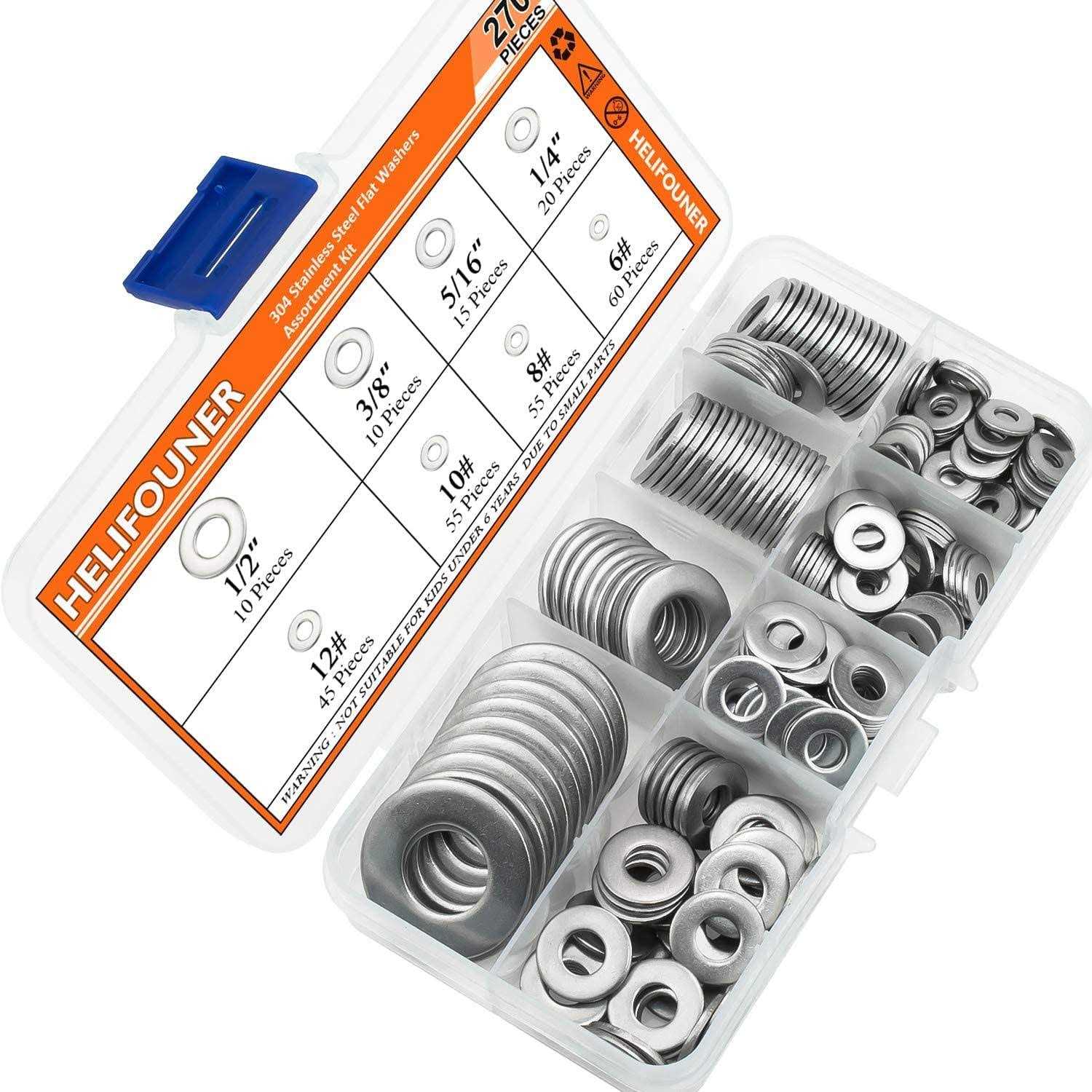 HELIFOUNER 270Pieces 8 Sizes Stainless Steel Flat Washers Assortment Kit, 1/2 3/8 5/16 1/4 12#10#8#6#