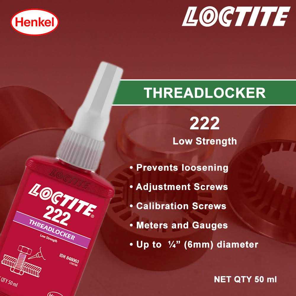 Ideal for low-strength threadlocking of adjusting screws, countersunk head screws and set screws Prevents loosening on vibrating assemblies, e.g. pumps, gear boxes or presses Permits disassembly with hand tools Especially suited to small thread sizes Easy to use LOCTITE 222 is a low-strength threadlocker that allows the adjustment of screws including countersunk head screws and set screws. Good on low-strength metals which could fracture during disassembly, e.g. aluminium or brass. The product works on all metals, including passive substrates such as stainless steel, aluminium and plated surfaces. t is proven to be tolerant of minor contamination due to industrial oils, e.g. engine oils, corrosion prevention oils and cutting fluids. br br Warning /b br Always read material safety data sheet and technical data sheet before using the product. Keep away from children. br br Please Note: /b The Volume in the bottle/tube is as described, but company has increased the size of the bottles then the normal for some safety norms during the shipment.