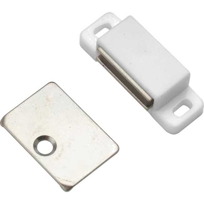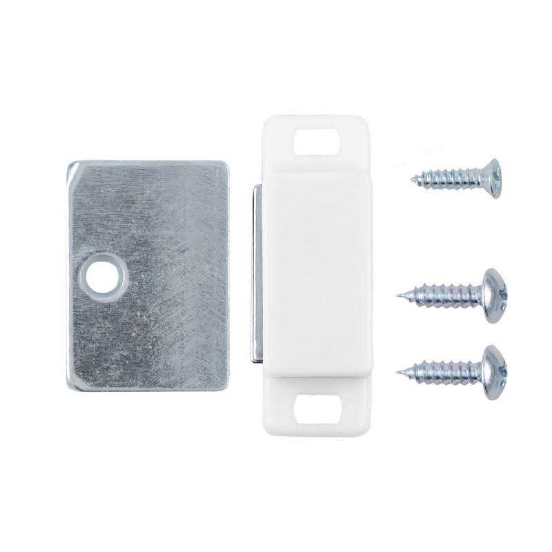 Two piece magnetic catch to keep cabinet doors closed and secure. A great door closure solution for any living space like kitchen or bathroom, and anywhere else a door needs to be kept closed like wardrobe, playroom or garage. The white finish allows the catch to blend in with light surfaces, and remain inconspicuous with neutral tones.