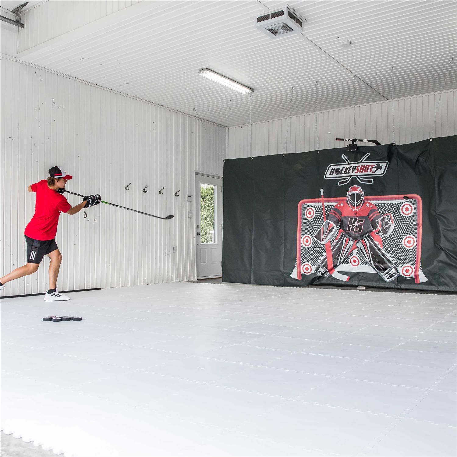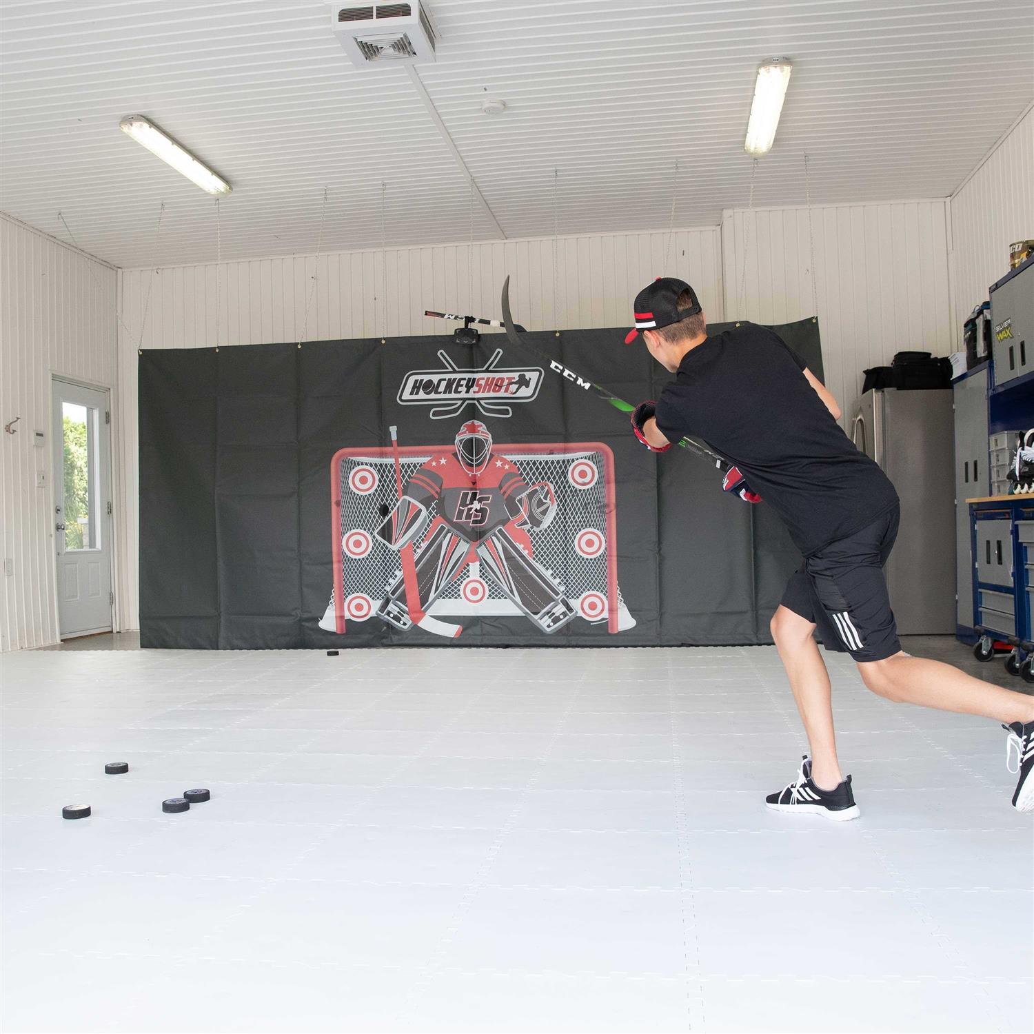 If you want the glory of a goal-scorer you have to practice your shot. The HockeyShot Extreme Hockey Shooting Tarp 2.0 lets you do that without the fear of damaging a wall or breaking a window. You can set it up inside or outside in any weather and get to work. Its slim profile has no pockets making it ideal for tighter spaces. The tarp measures 7′ x 16′. Protect the house and practice safe hockey. Features: Easy installation and removal. Design minimizes visibility of dirt. No pockets so there’s no need to collect pucks from pouches after hitting targets. Ideal for tighter spaces as you need less room between the tarp and the wall. Features a strap to hang your Reactive Sniper from for your training sessions. Designed for residential use.