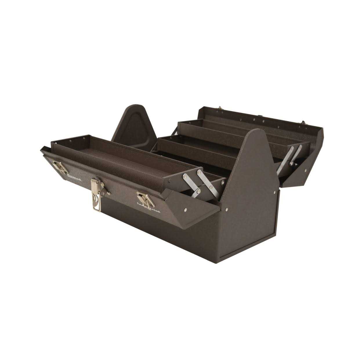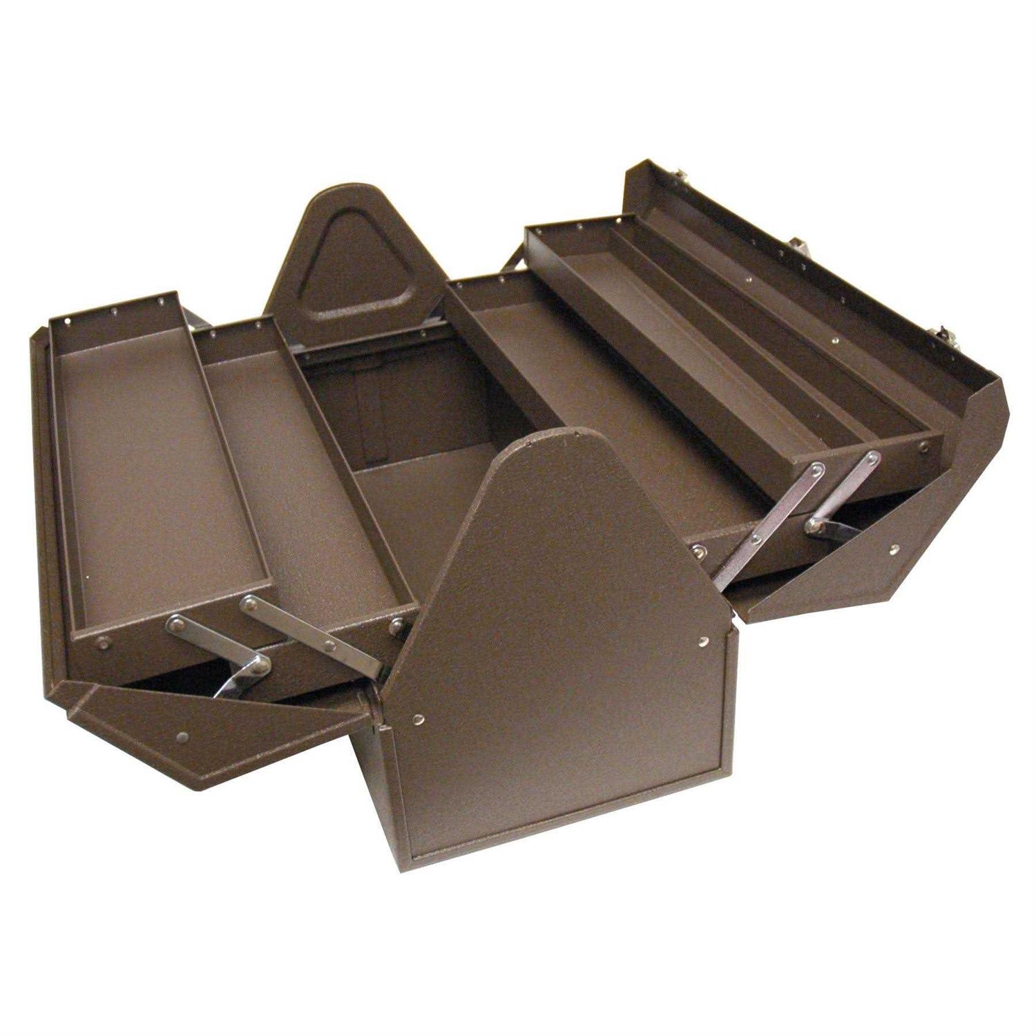 Keep your tools organized with the Homak BW00210220 Steel Industrial Expanding Cantilever 22 Inch Toolbox, Brown. This steel toolbox features four expanding cantilever shelves. Theses shelves allow you to easily see your entire assortment of tools, so you can find the right one for the job. This toolbox also features a large storage area below the shelves. The area is perfect for larger tools or additional equipment and accessories. Protect yourself from theft with the specially made locking clasp. The clasp features a small steel loop, intended for a small padlock. Two additional clasps help secure the toolbox lid closed. Keep your tools safe and organized on the job. This steel toolbox will stand up to abuse for years to come.